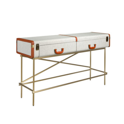 Table console rectangulaire, tissu, noyer et acier poli doré