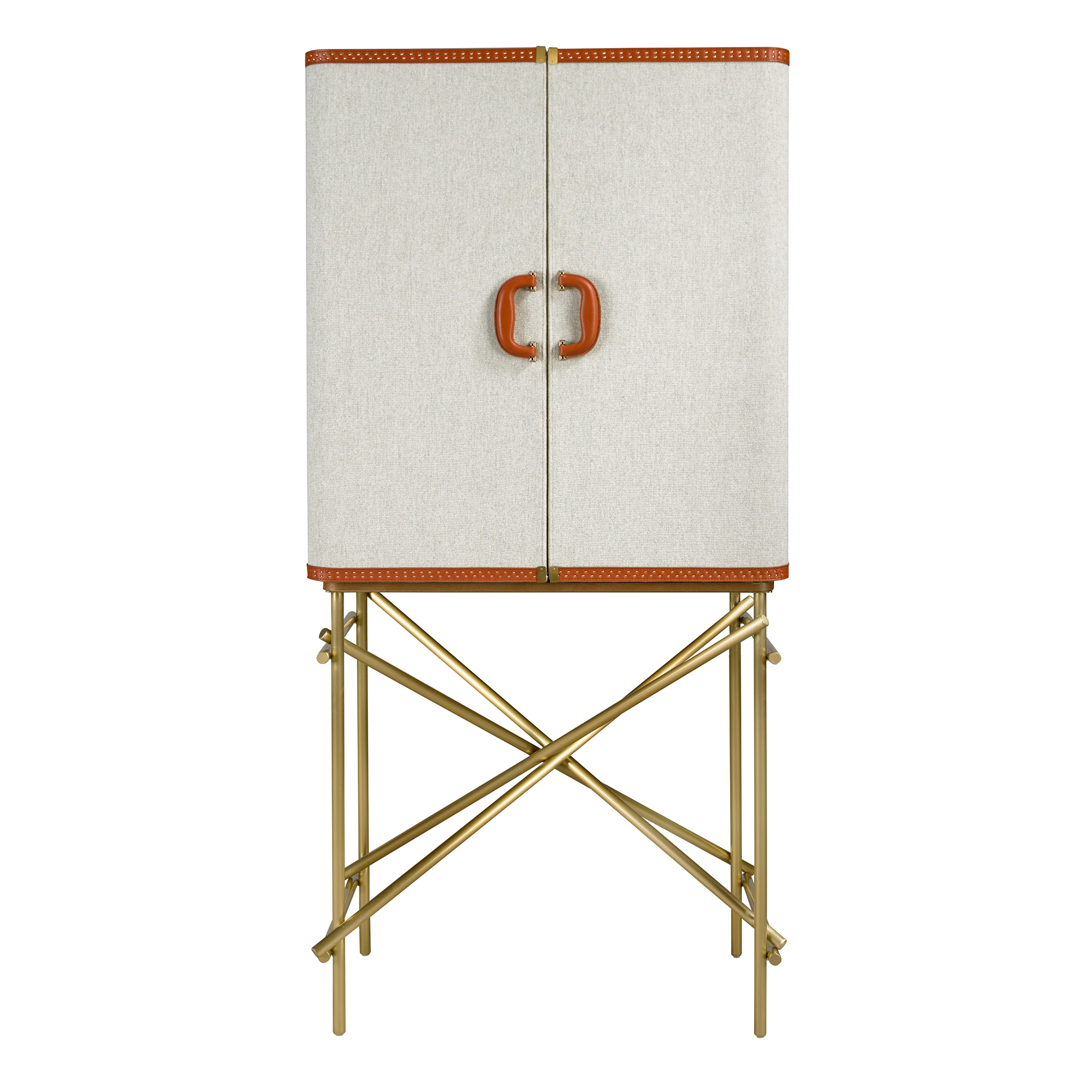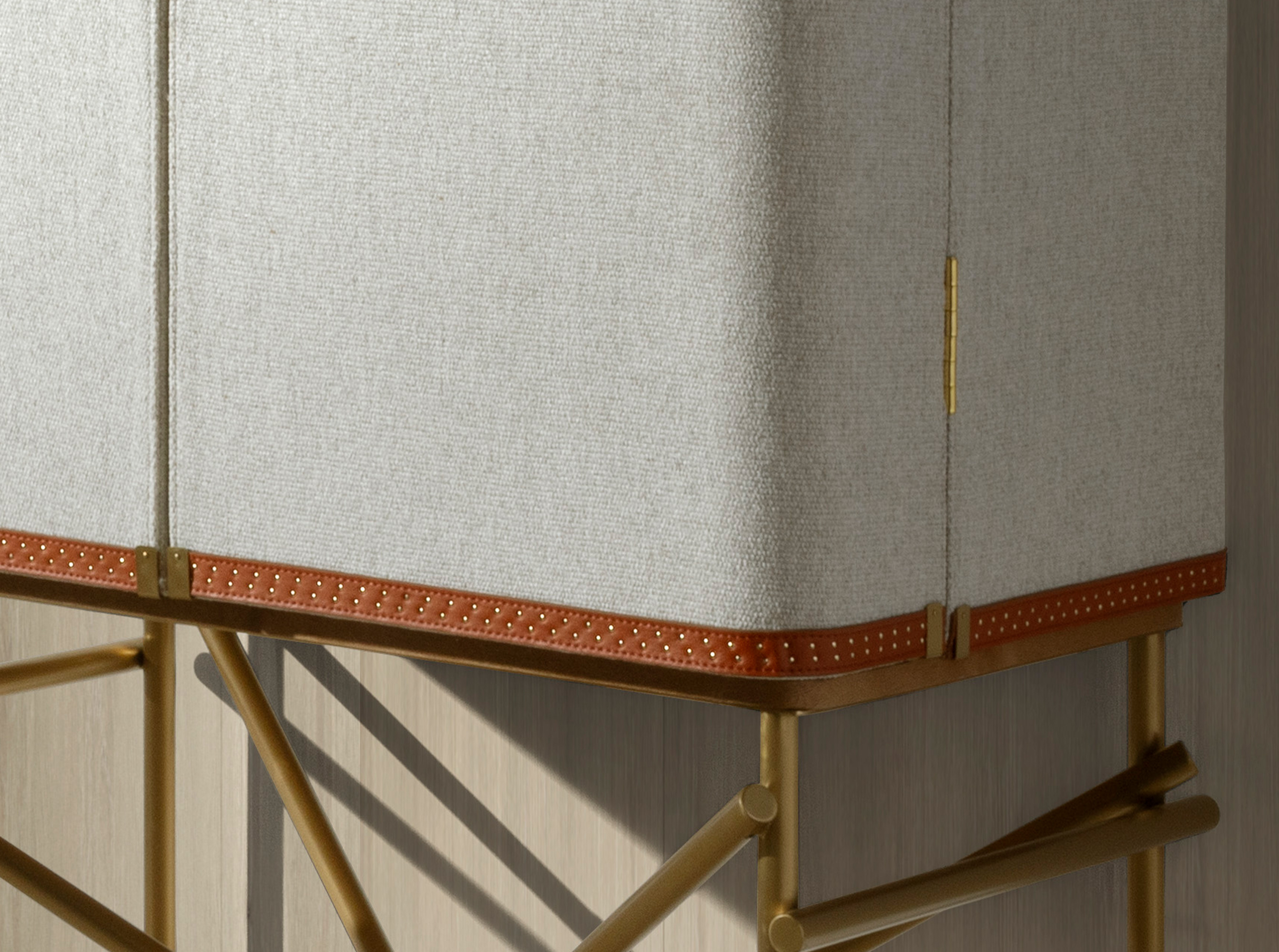 Buffet haut au design moderne avec structure en bois plaqué de noyer naturel revêtu de tissu gris clair et pieds originaux en acier inoxydable poli de couleur dorée. Ses détails originaux en cuir de vachette ajoutent une touche de style à votre salon.