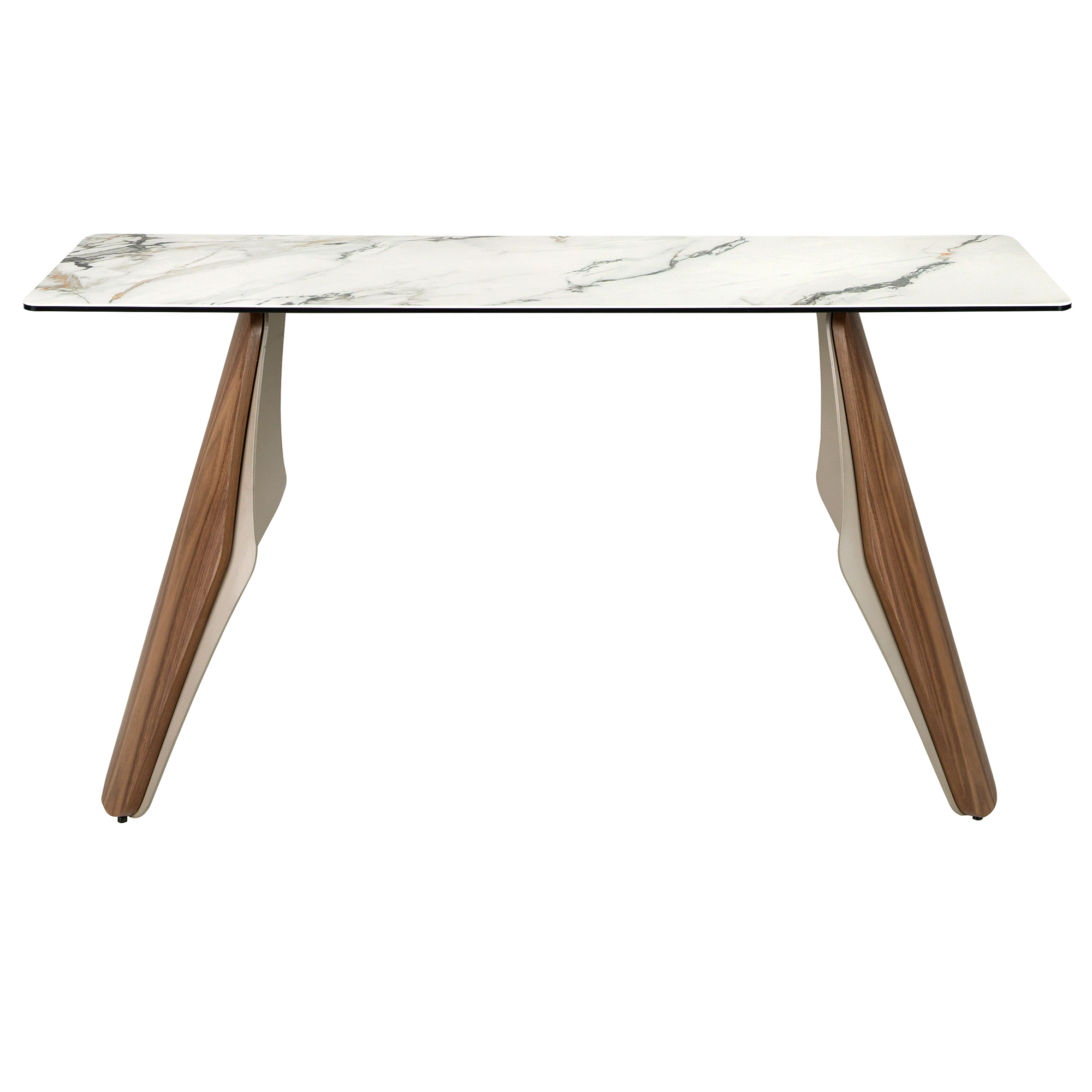 Console rectangulaire au design moderne avec plateau en marbre porcelanique blanc avec des veines dans des tons gris et marron en finition mate. Pieds originaux en acier inoxydable peint couleur sable à effet métallisé et bois plaqué noyer naturel de 0,5 mm d’épaisseur. Une pièce au design simple et original qui apportera une touche unique et personnelle.