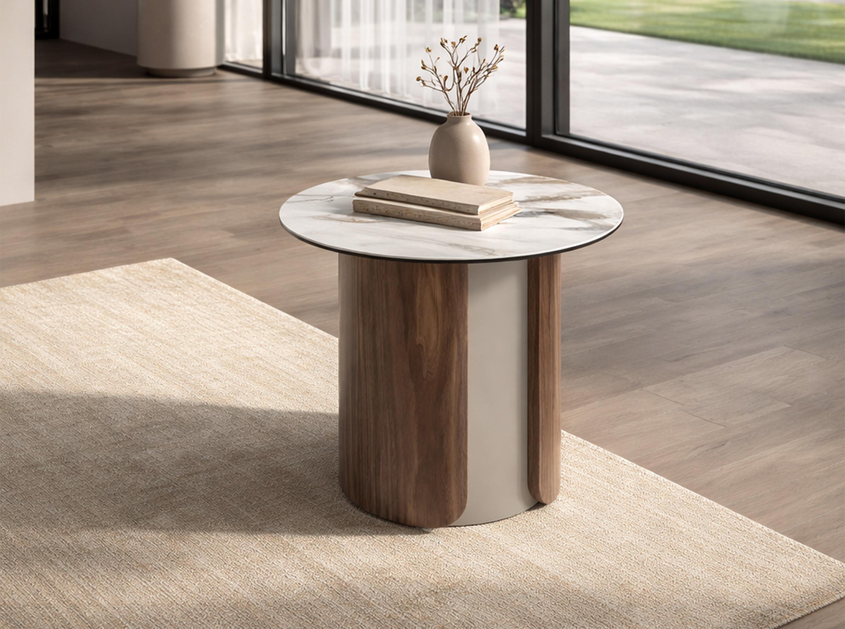 Table d’angle ronde en marbre fibre de verre et bois de noyer