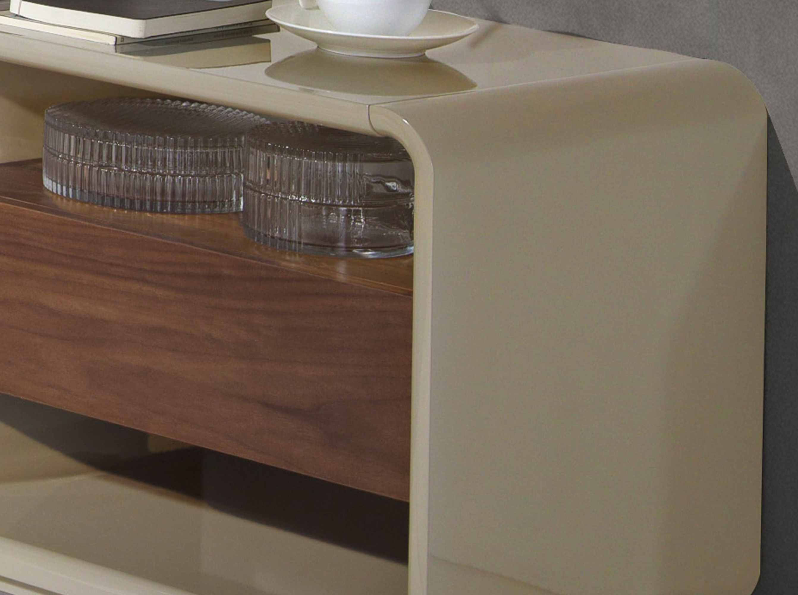 Table de chevet au design moderne avec une structure originale en bois MDF laqué en finition brillante Mist Grey. Une table de chevet au style élégant et sophistiqué qui présente une structure de tiroir frontal en bois plaqué de noyer naturel, laissant deux ouvertures pour le rangement.