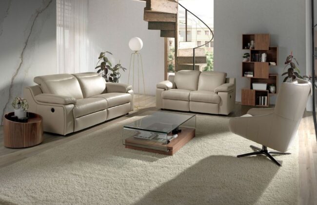El corazón del salón se compone de un sofá chaiselongue en piel gris taupe (ref. 7317) que combina confort y modernidad. Su diseño envolvente y tapizado en piel natural aporta elegancia y durabilidad, mientras su tonalidad neutra encaja con cualquier estilo de decoración. Complementa la zona de estar un sillón giratorio de piel gris taupe haciendo juego con el chaiselongue (ref. 7108), que añade dinamismo visual y funcionalidad al conjunto.