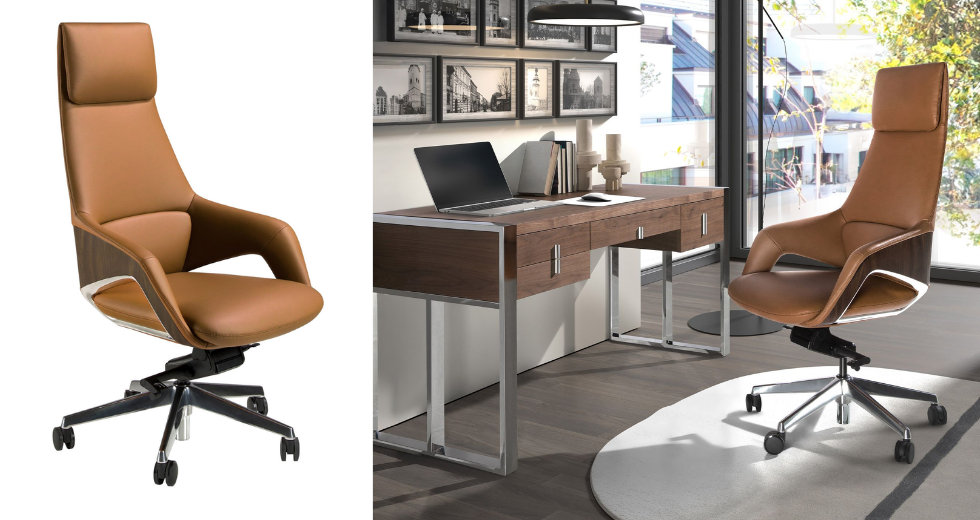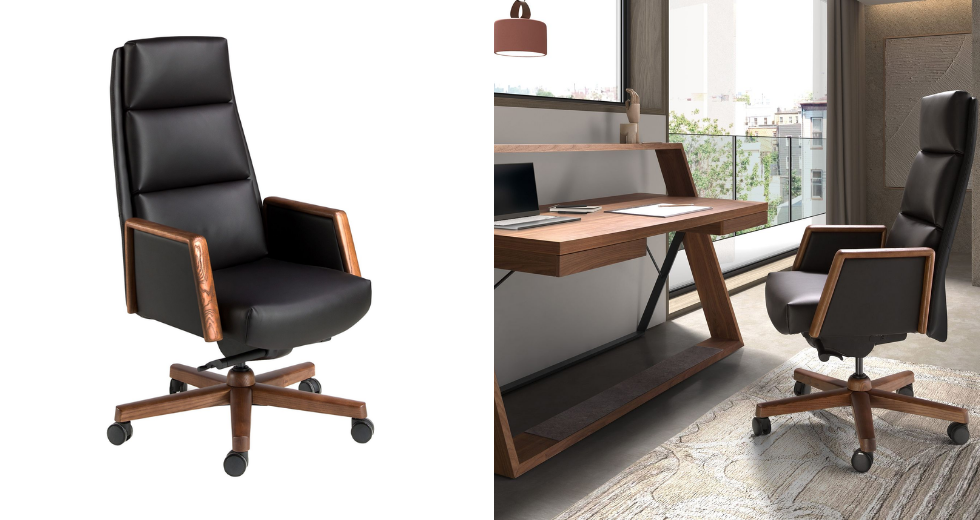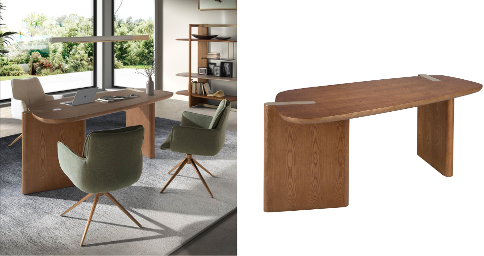 Un despacho ejecutivo corporativo con escritorio en nogal puede encontrar su réplica doméstica en una versión más compacta, acompañada de una silla giratoria en polipiel marrón o negro. Esta continuidad refuerza la identidad personal del líder y consolida una imagen homogénea ante clientes y colaboradores.