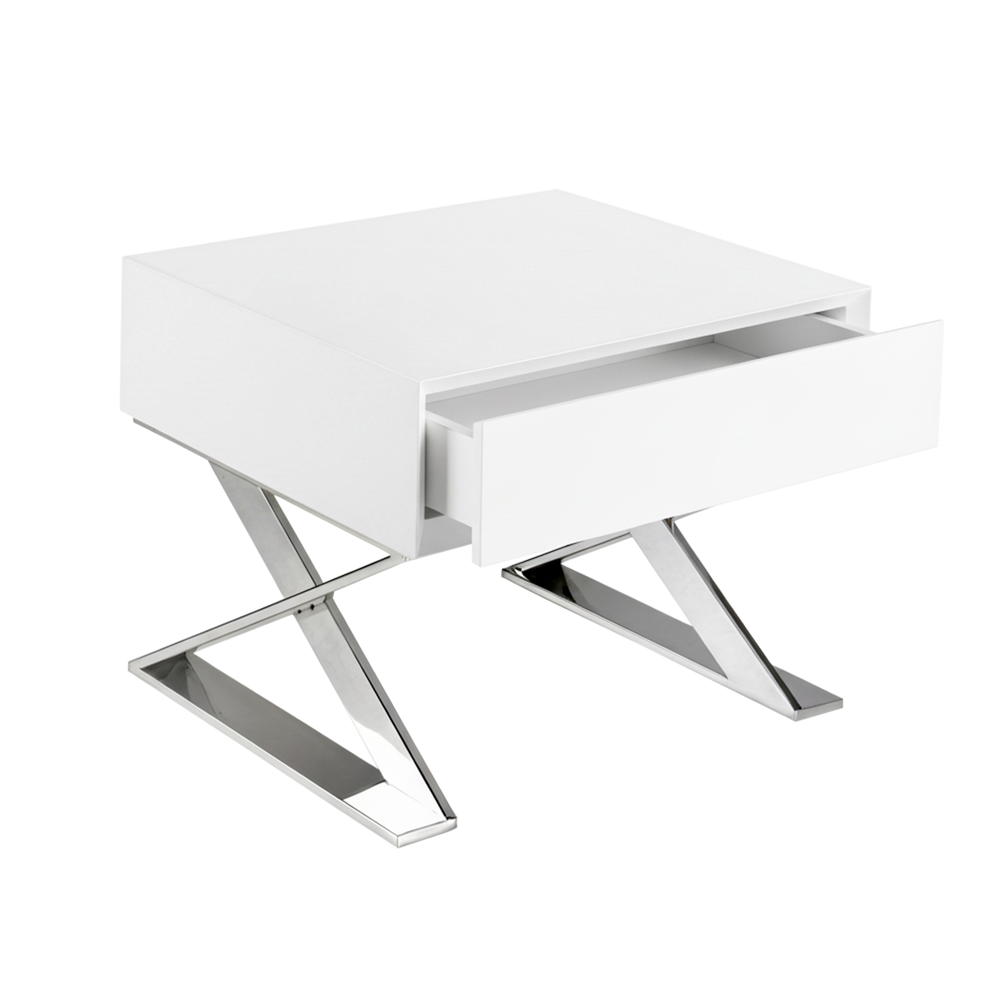 Прикроватная тумбочка с крестовиной из стали, модель 7007 Angel Cerdá S.L. Прикроватная тумбочка современного дизайна с оригинальной конструкцией крестовины ножек из хромированной нержавеющей стали 22 мкм и ящиками из МДФ, покрытой глянцевым белым лаком, тон RAL 9003. Элегантная и изысканная прикроватная тумбочка превосходно передает авангардизм и стиль вашей спальни, а также позволяет содержать все в порядке благодаря вместительному двойному ящику с системой плавного закрывания.•СТИЛЬ : Эта оригинальная прикроватная тумбочка современного дизайна придаст особый изысканный вид вашей спальне. Дизайнерская отделка идеально сочетается с последними тенденциями в интерьере.