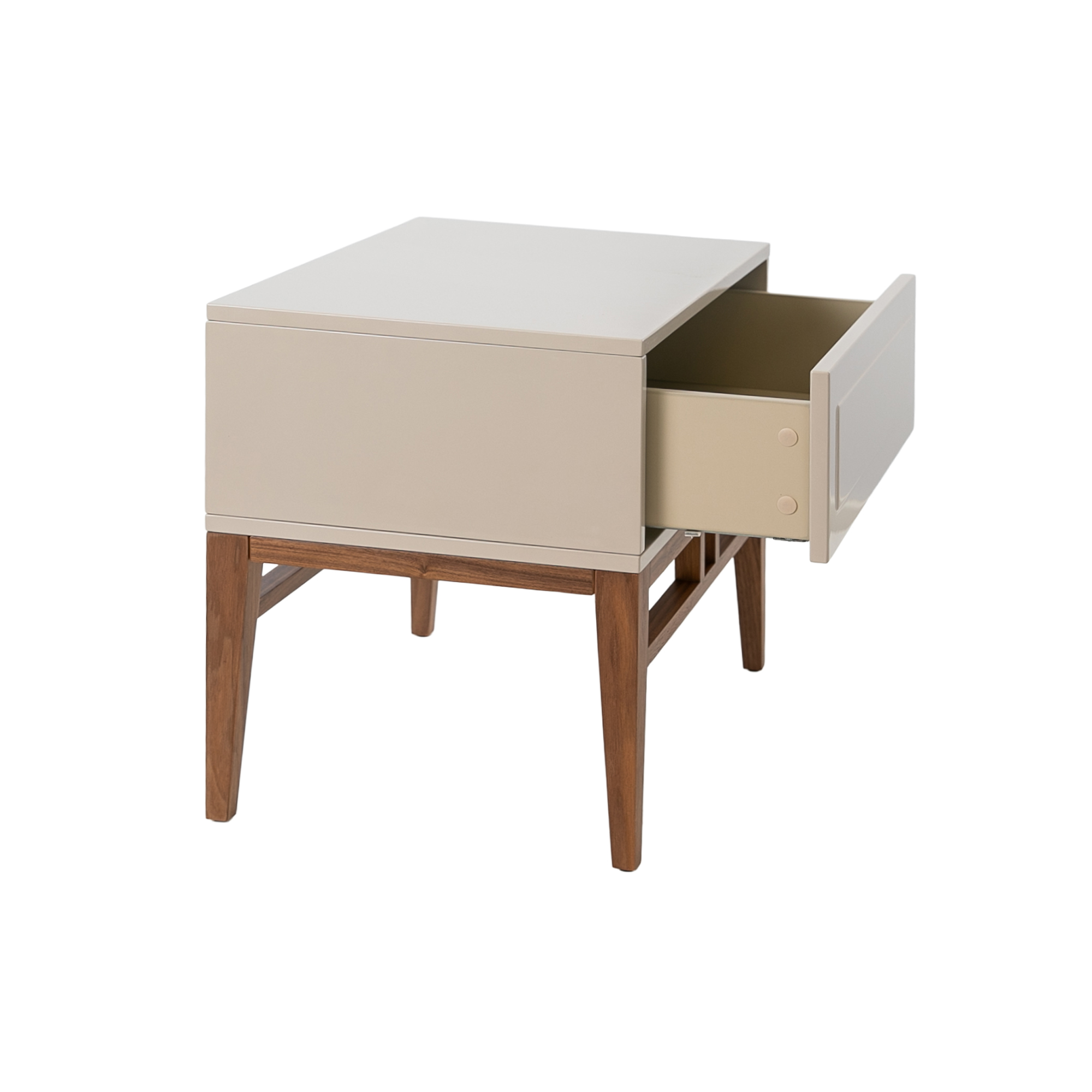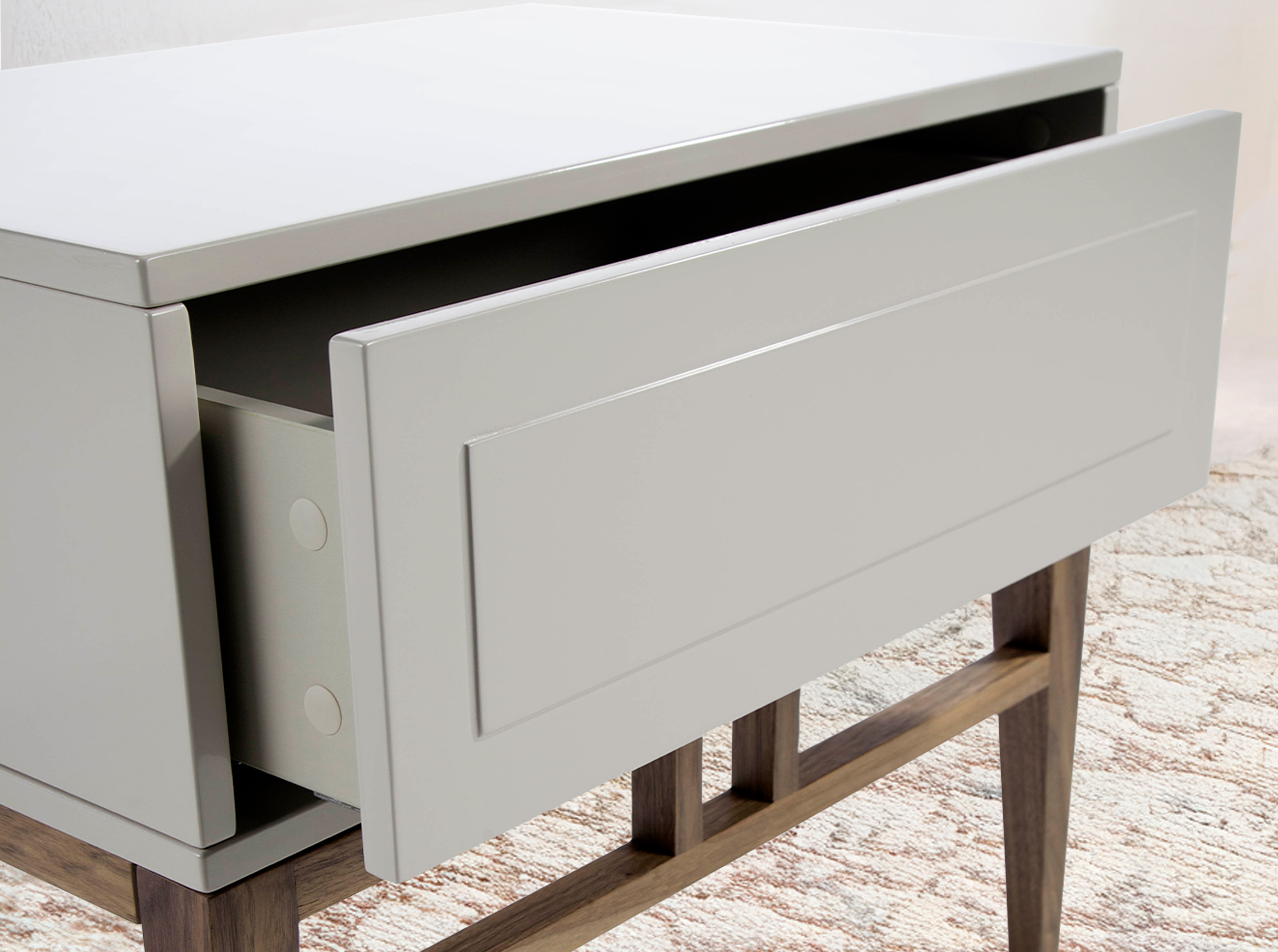 Прикроватная тумбочка, серый цвет и ореховое дерево, модель 7035 Angel Cerdá S.L. Прикроватная тумбочка современного дизайна из МДФ, покрытой глянцевым лаком, тон RAL 7044 Серый шелк, в сочетании с оригинальной конструкцией ножек из дерева, покрытого шпоном из натурального орехового дерева толщиной 0,5 мм. Элегантная и изысканная прикроватная тумбочка превосходно передает актуальный стиль вашей спальни, а также позволяет содержать все в порядке благодаря вместительному двойному ящику с системой открывания нажатием и плавного закрывания.•СТИЛЬ : Эта оригинальная прикроватная тумбочка современного дизайна придаст особый изысканный вид вашей спальне. Дизайнерская отделка идеально сочетается с последними тенденциями в интерьере.