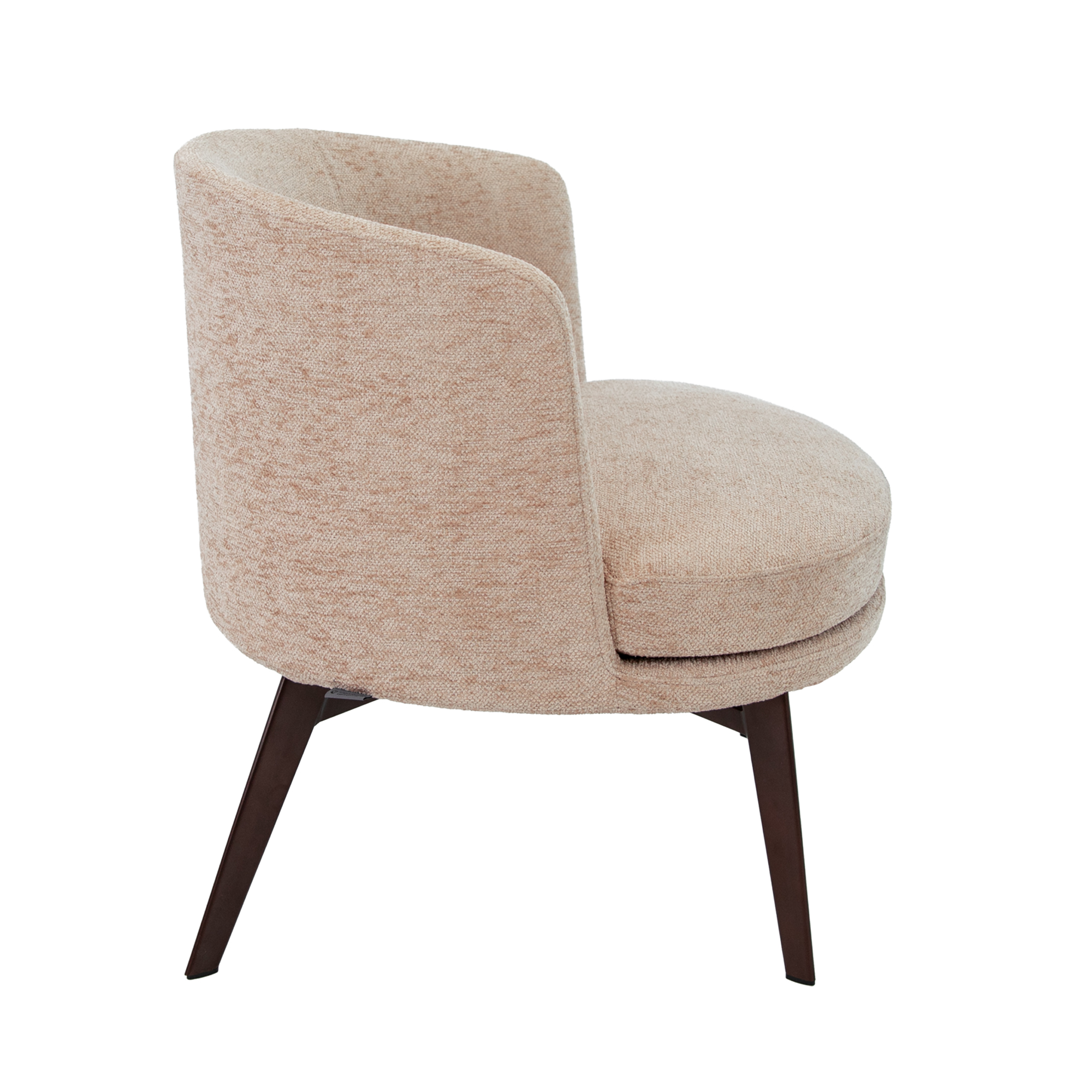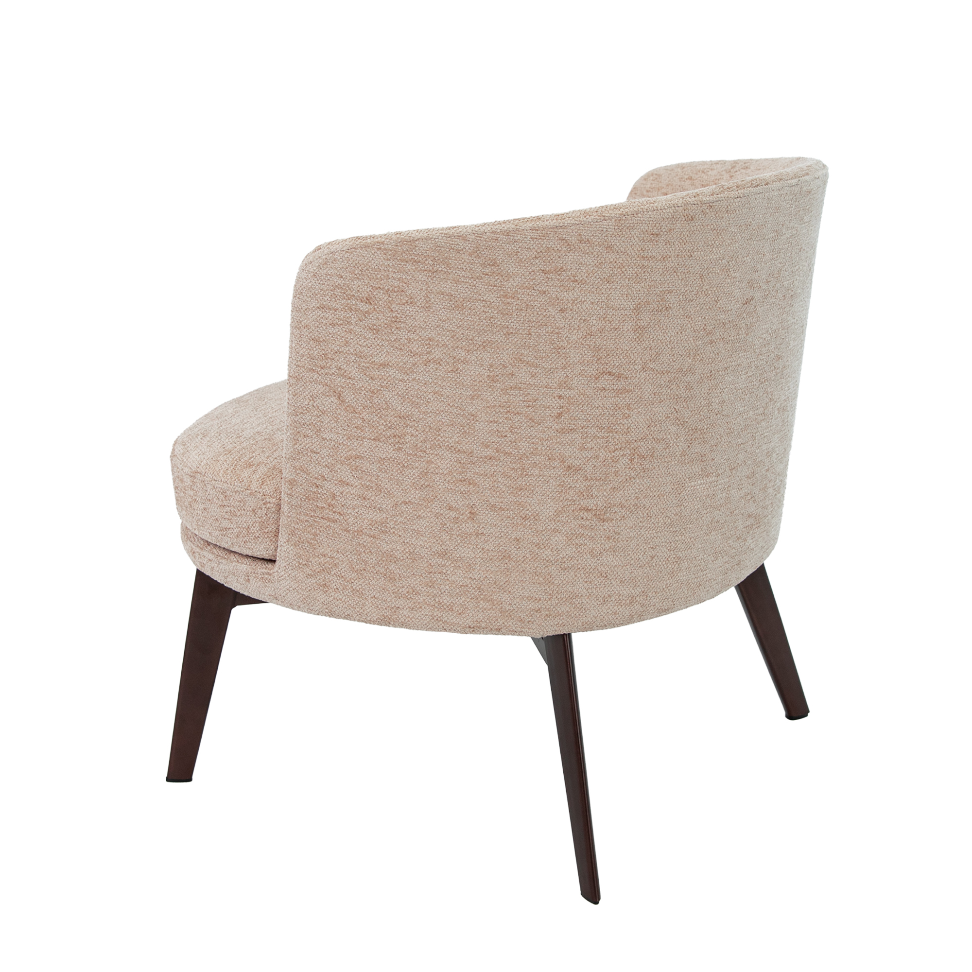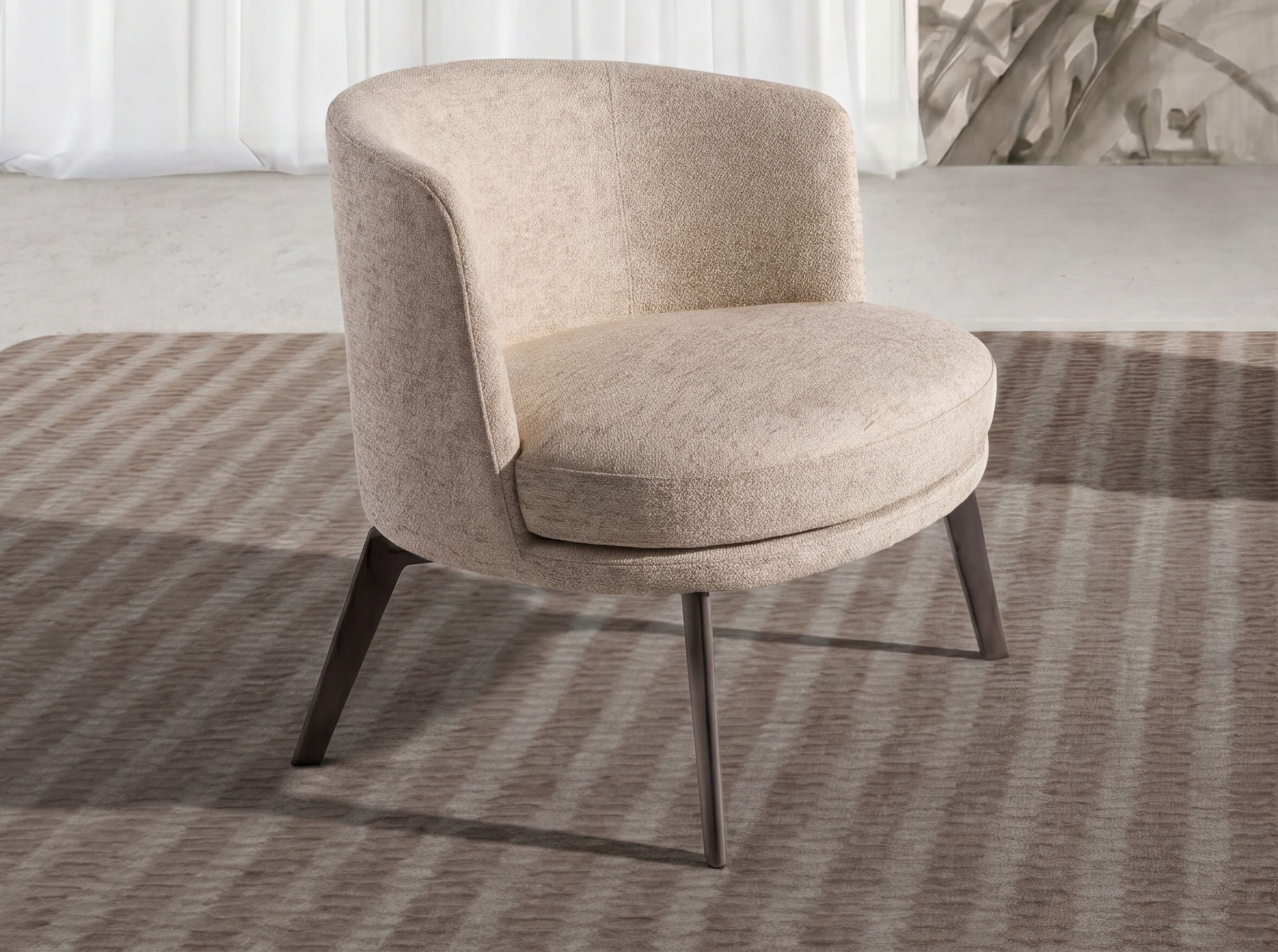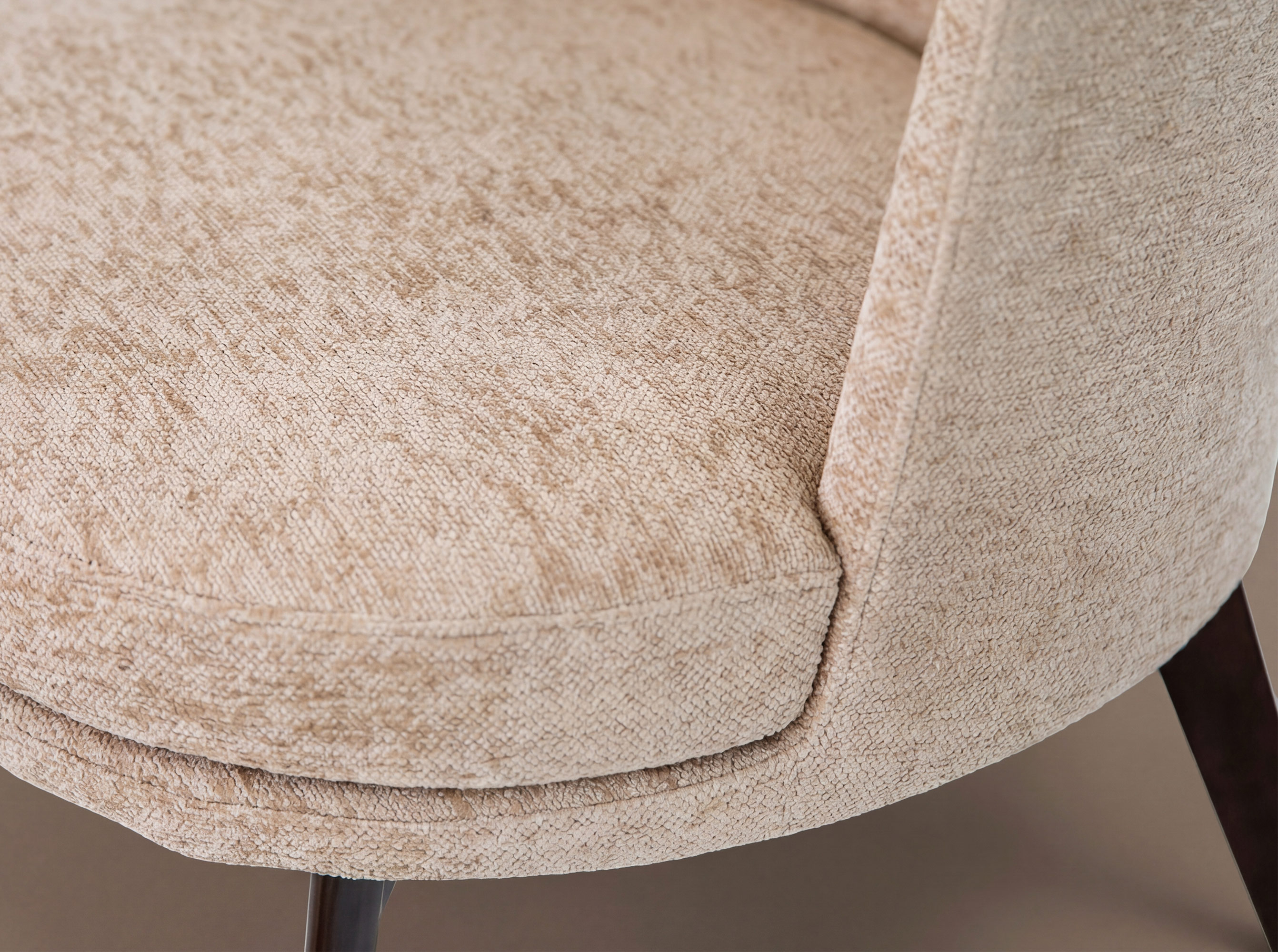 Кресло современного дизайна с сиденьем и спинкой, обитыми кремовой тканью. Это кресло — идеальное сочетание дизайна и комфорта, как благодаря своему стилю, так и благодаря ножкам из нержавеющей стали цвета коричневого металла.