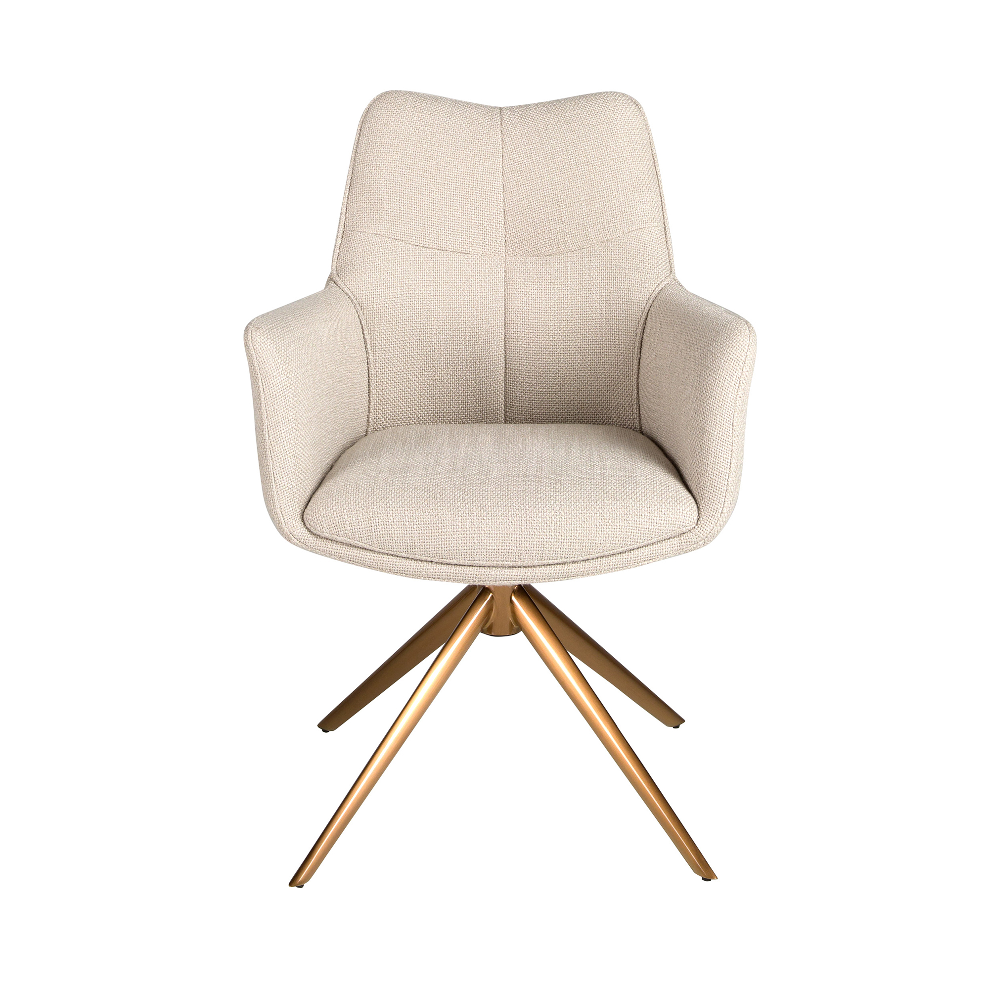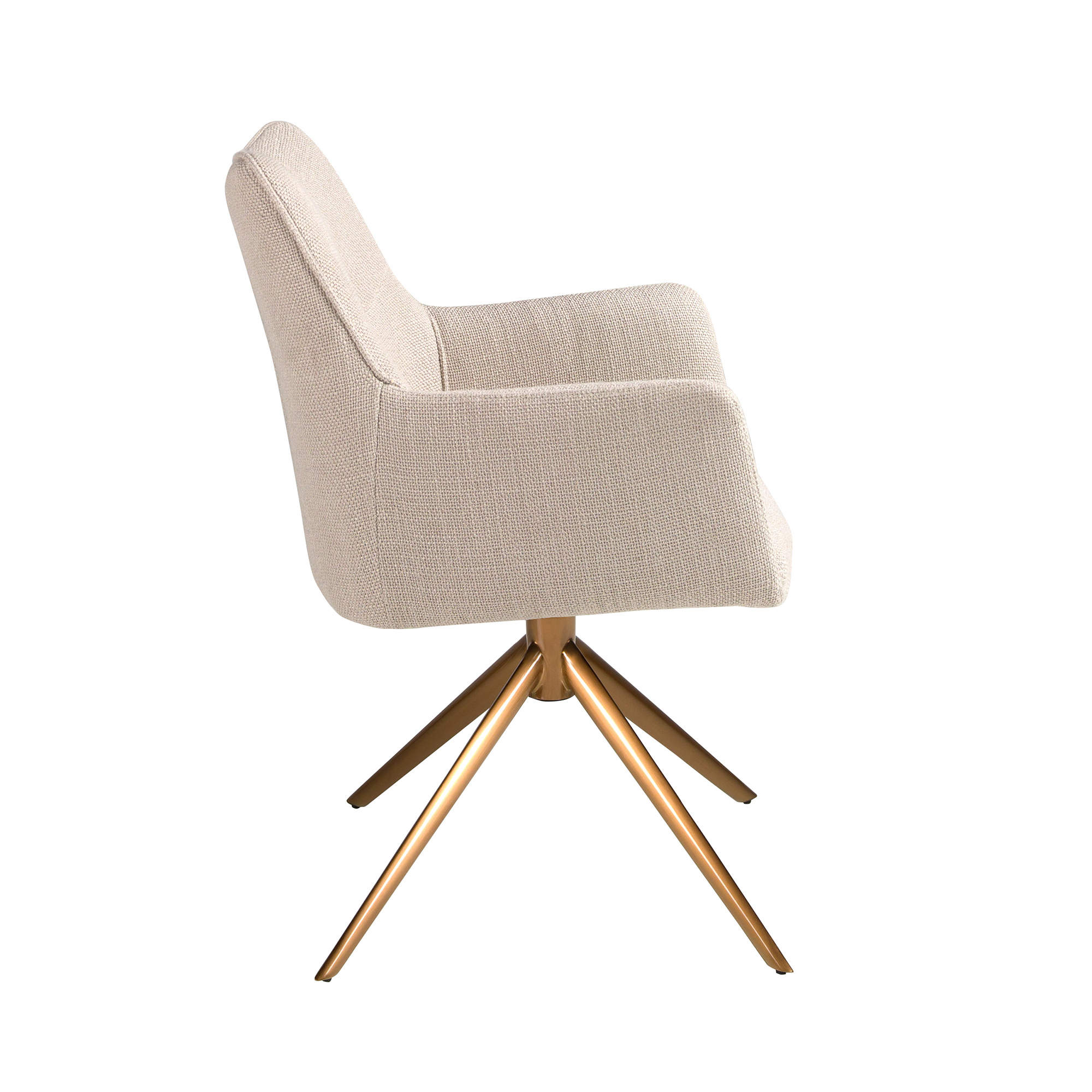 Современный поворотный стул с подлокотниками с сиденьем и спинкой, обитыми тканью кремового цвета. Его ножки из нержавеющей стали, окрашенной в бронзовый цвет, сочетающие авангардный и вневременной стиль, сделают его обязательным элементом вашей кухни или столовой. Этот стул бренда Angel Cerdá сочетает уникальный и индивидуальный стиль марки с максимальным комфортом и устойчивостью благодаря высокому качеству обивки и оригинальной конструкции ножек.
