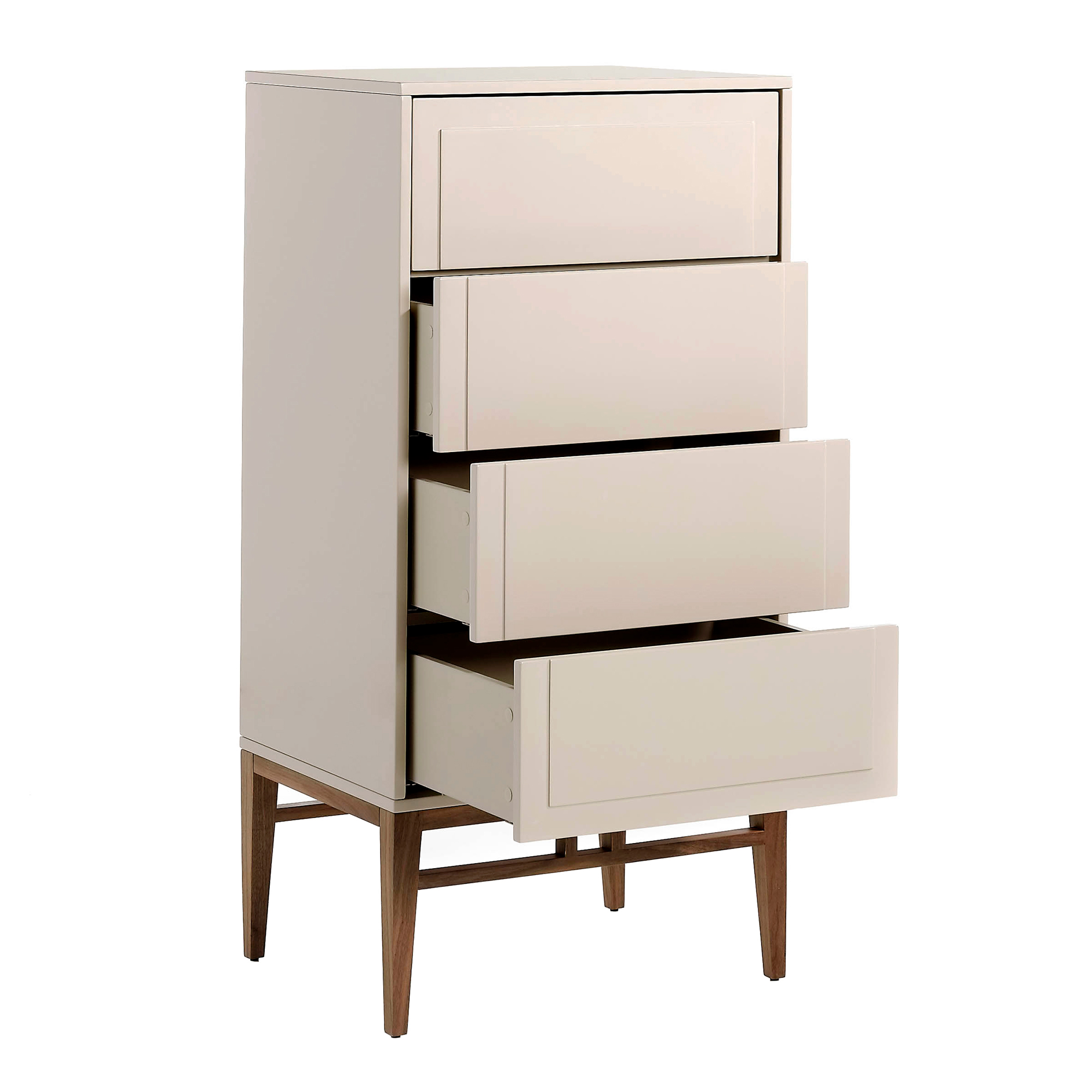 Chiffonnier mit 4 Schubladen, Beine aus Walnussfurnierholz und lackierte MDF-Schubladen