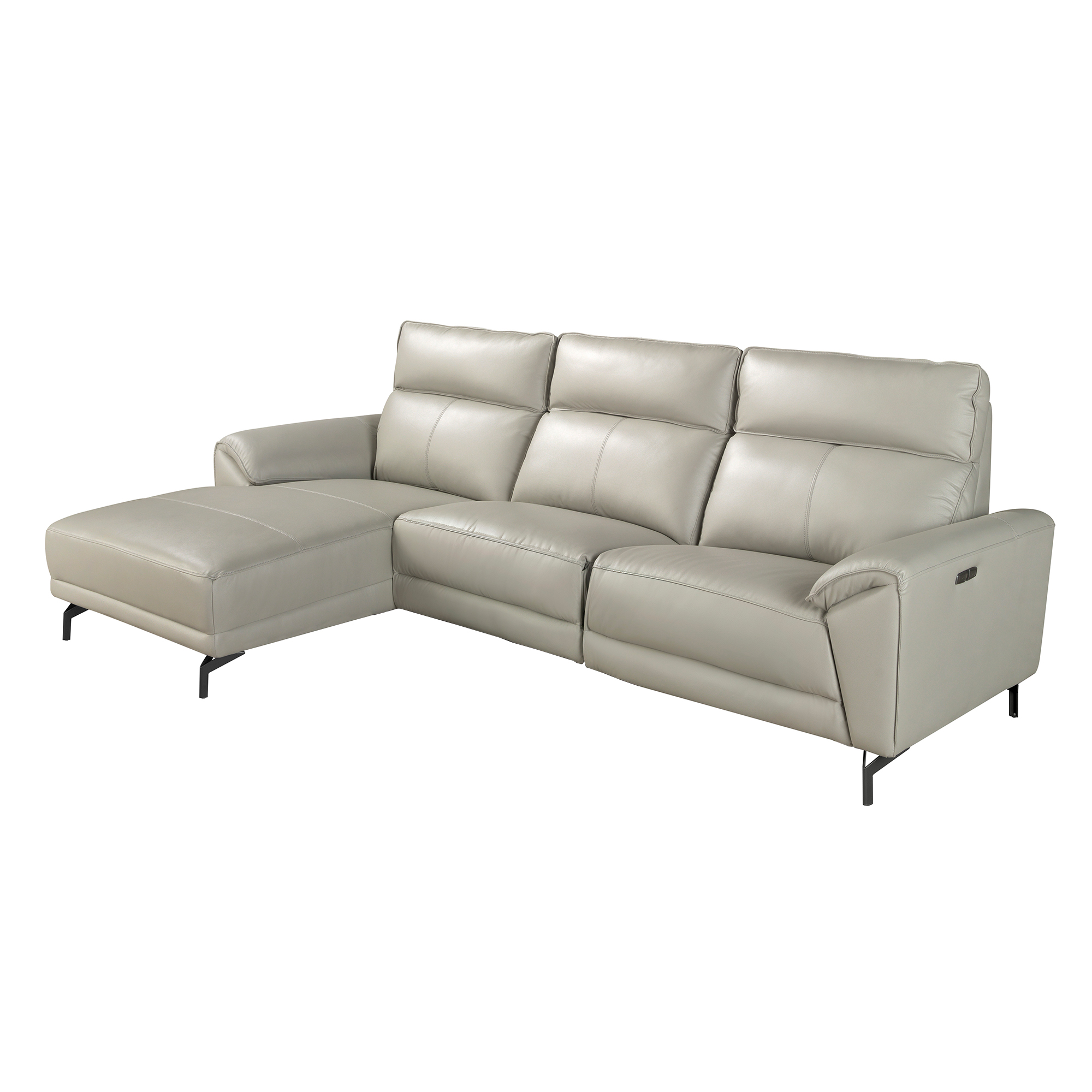 Dieses 5-sitzige Chaiselongue-Sofa mit modernem Design ist mit grauem Rindsleder gepolstert. Sowohl durch seinen Stil als auch durch seine mattschwarzen Edelstahlbeine bringt dieses Sofa einen Hauch von Avantgarde und Eleganz in Ihr Zuhause.