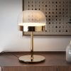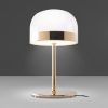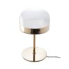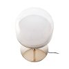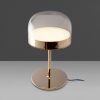 Table lamp with a modern design with a golden steel base and a transparent tempered glass shade. An elegant and easy to assemble lamp that will bring warmth and elegance to your home.