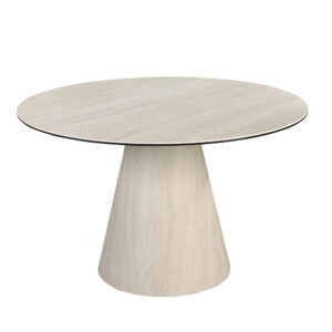 Round dining table in porcelain marble and wood covered with a flexible porcelain marble sheet