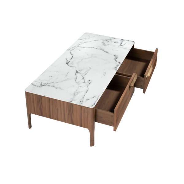 Modern design rectangular coffee table with white porcelain marble imitation glass top with grey veins in glossy finish and original wooden legs veneered in natural walnut. A piece with a simple yet original design that will add a unique and personal touch.