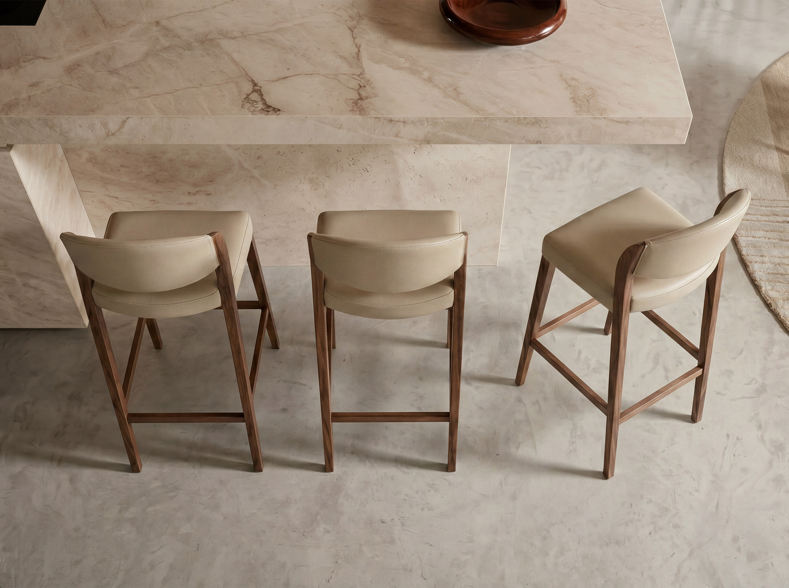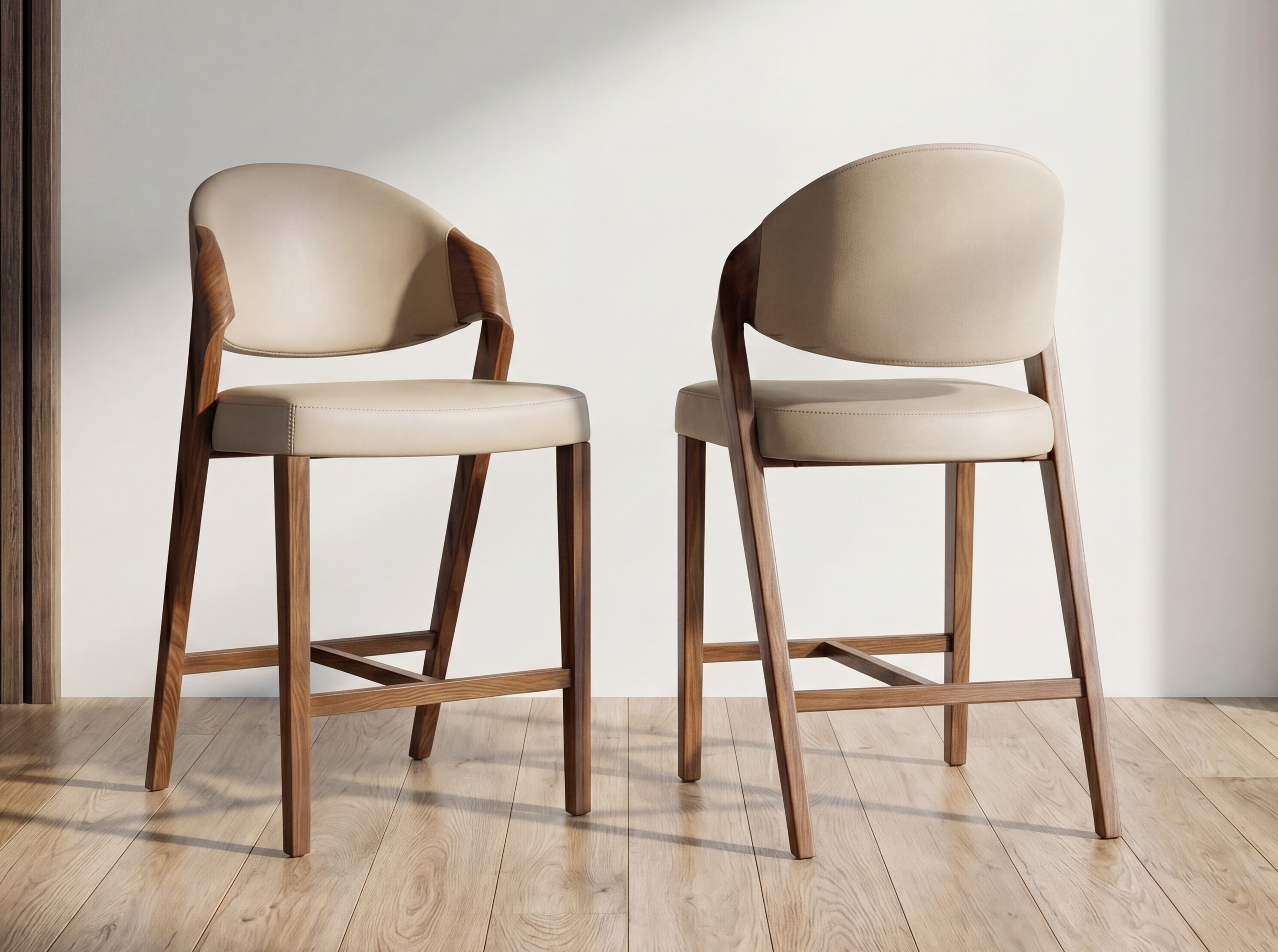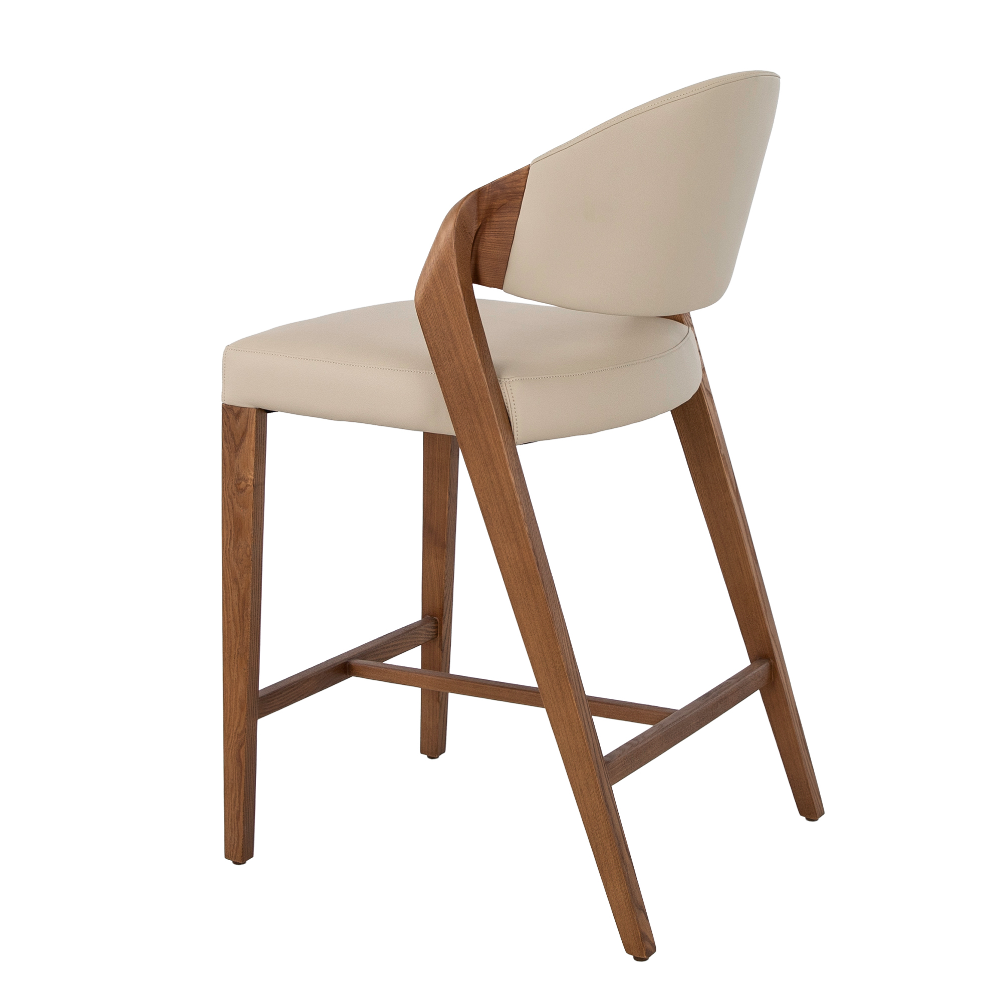 Modern design stool with seat and backrest upholstered in mink-coloured leatherette. Its walnut-coloured wooden legs, with a design that is both avant-garde and timeless, will make it a must-have for your kitchen or dining room. This stool by Angel Cerdá combines the brand’s unique and personal style with maximum comfort and stability, thanks to the high quality of its upholstery and the original structure of its legs.