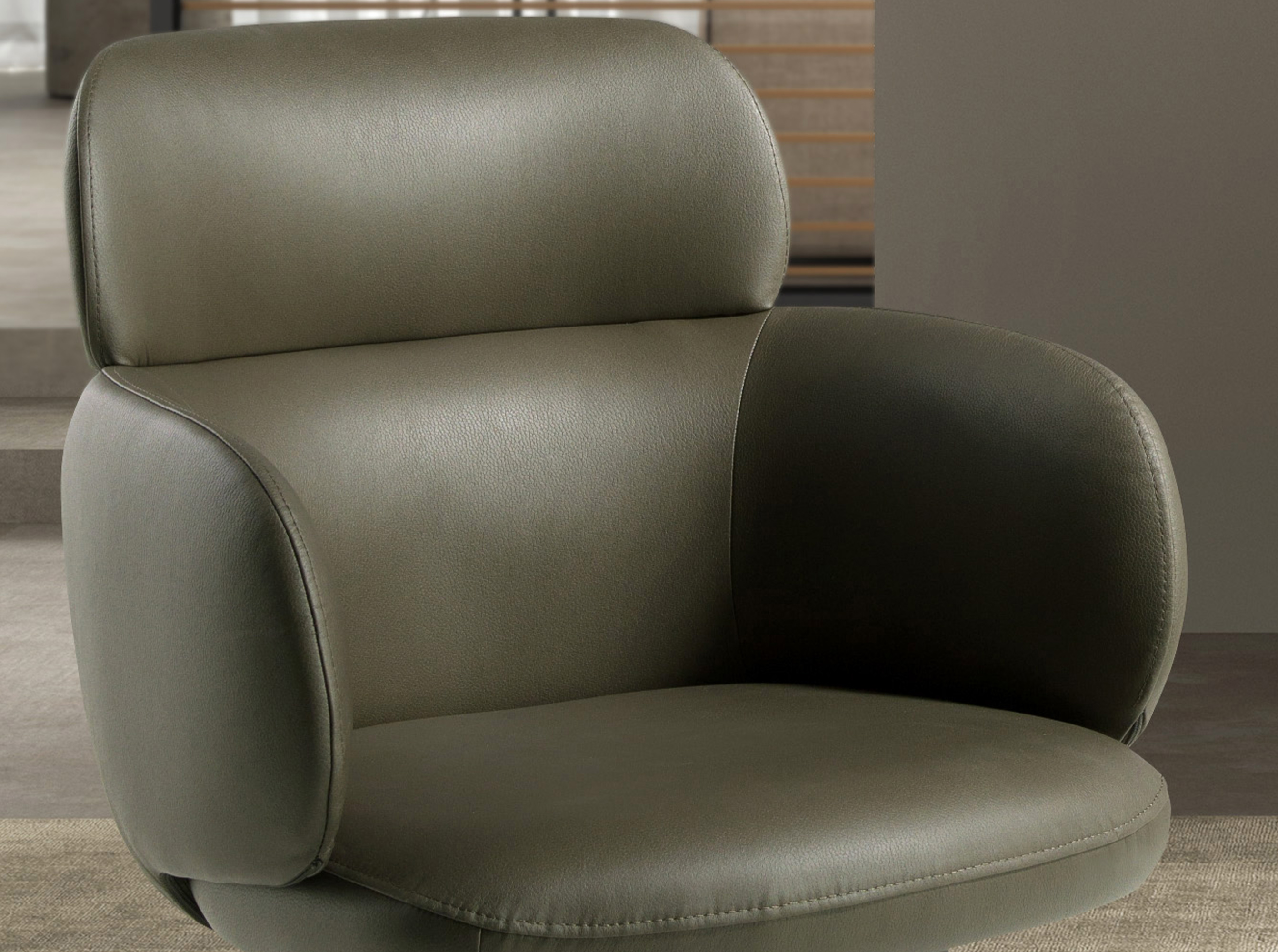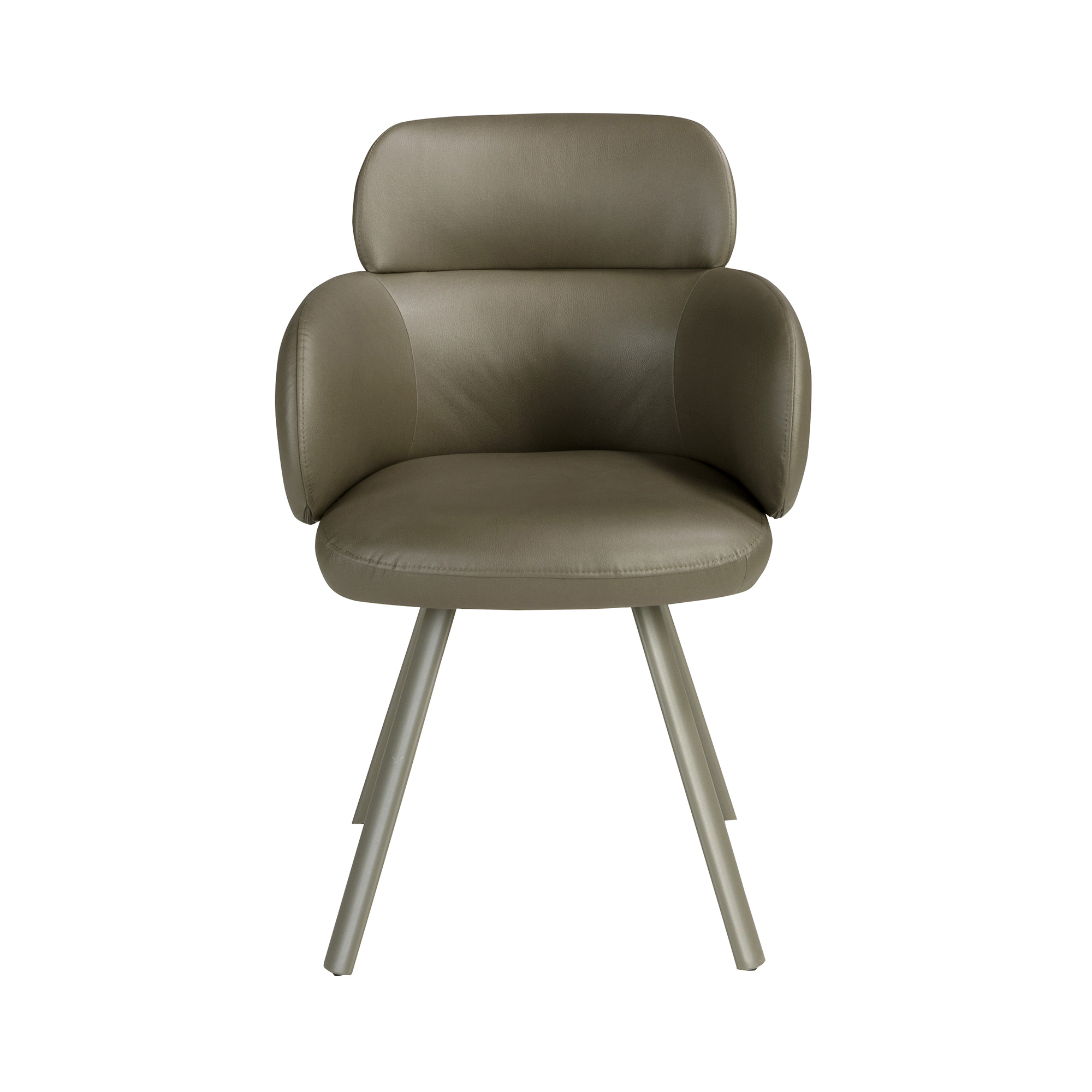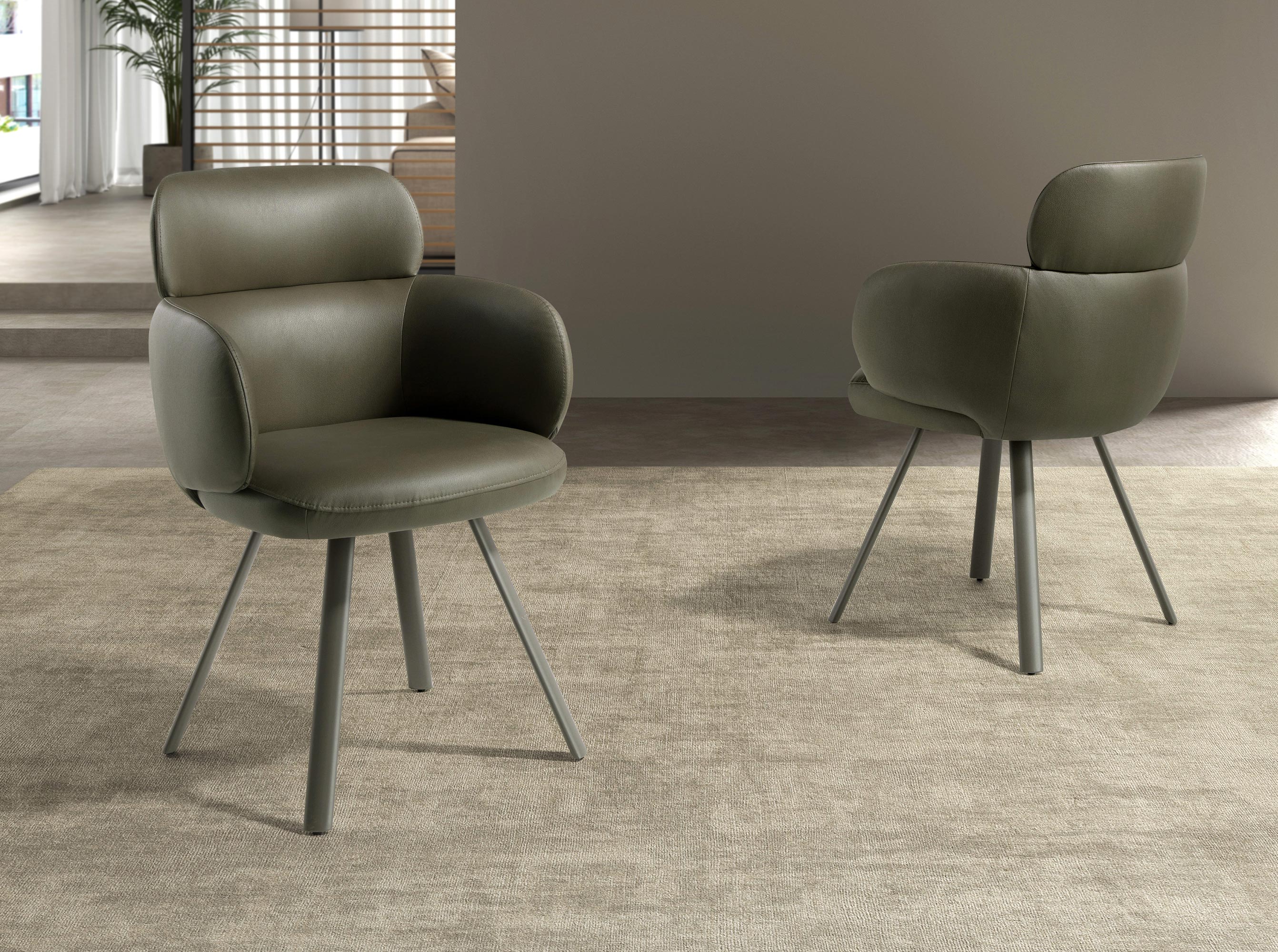 Modern design swivel chair with armrests with seat and backrest upholstered in olive green leatherette. Its green stainless steel legs, with a design that is both avant-garde and timeless, will make it a must-have for your kitchen or dining room. This chair by Angel Cerdá combines the brand’s unique and personal style with maximum comfort and stability, thanks to the high quality of its upholstery and the original structure of its legs.