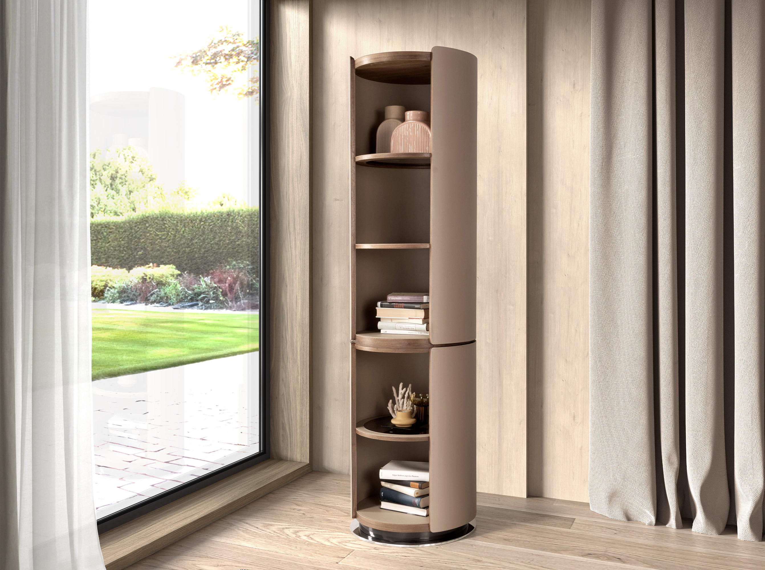 – The combination of upholstered wooden shelves and smoked black glass creates an elegant contrast of materials and textures, achieving a perfect balance between warmth and visual lightness.