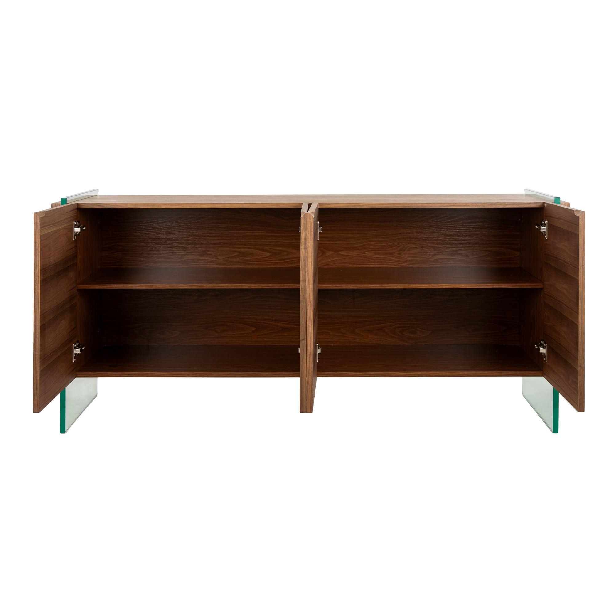 Aparador de madera chapada en nogal con laterales de cristal templado