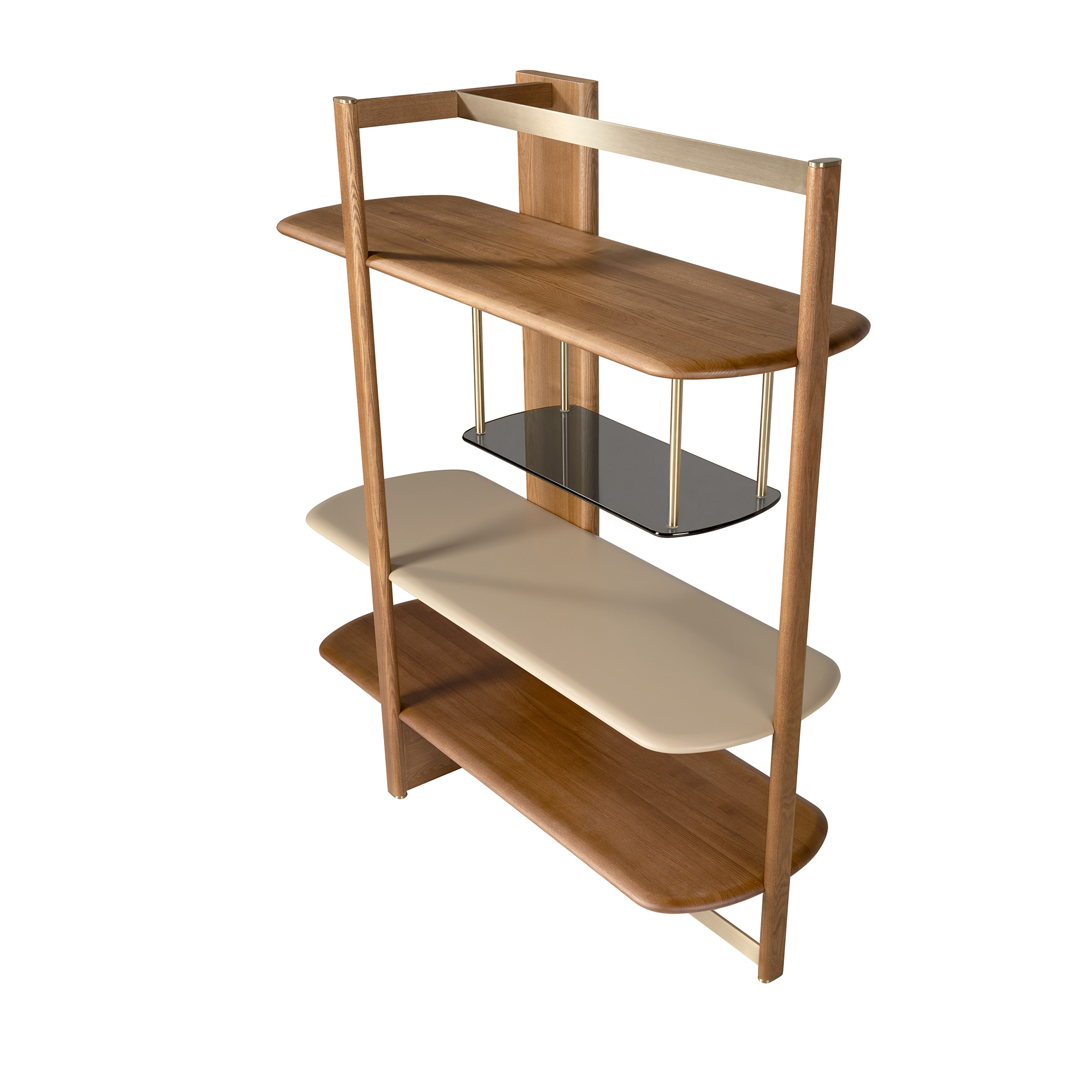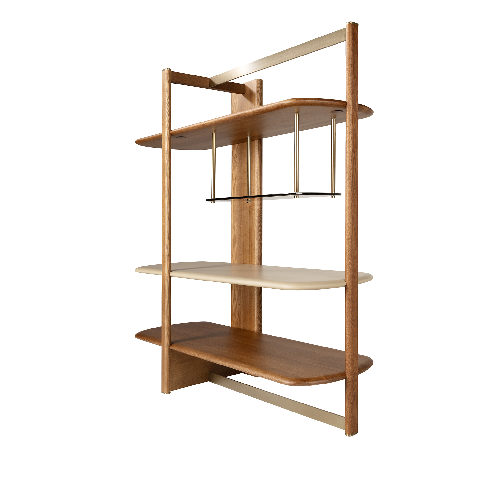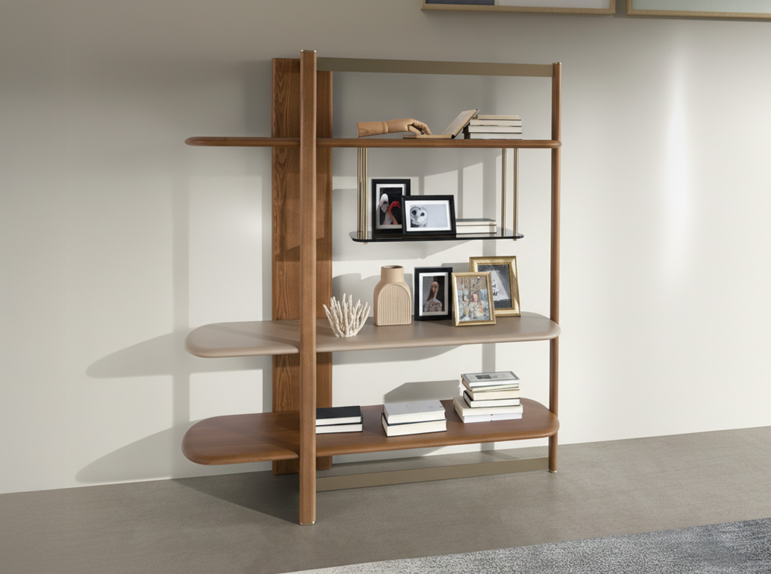 Estantería de diseño moderno con estructura y baldas en madera color nogal claro, combinadas con baldas en DM lacado color Greige y en cristal fumé marrón. Sus detalles en acero inoxidable color dorado pulido aportan un elegante contraste, creando una pieza equilibrada y sofisticada, ideal para salones y espacios contemporáneos.
