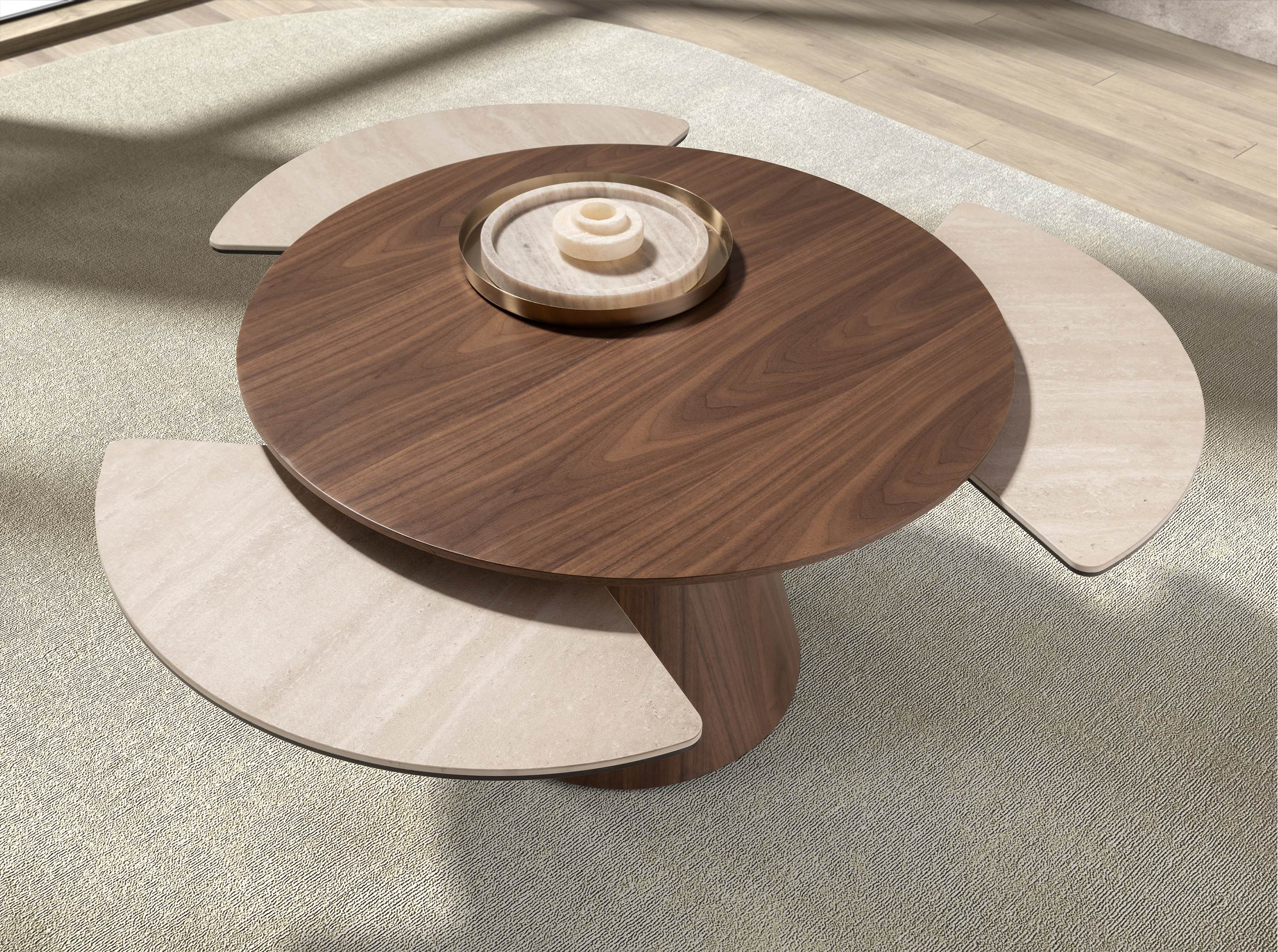 Mesa centro extensible redonda de diseño moderno con tapa de madera chapada en nogal natural y mármol porcelánico color arena en acabado mate y unas originales patas de madera chapada en nogal natural. Una pieza con un diseño sencillo a la vez que original, con la que aportará un toque único y personal.