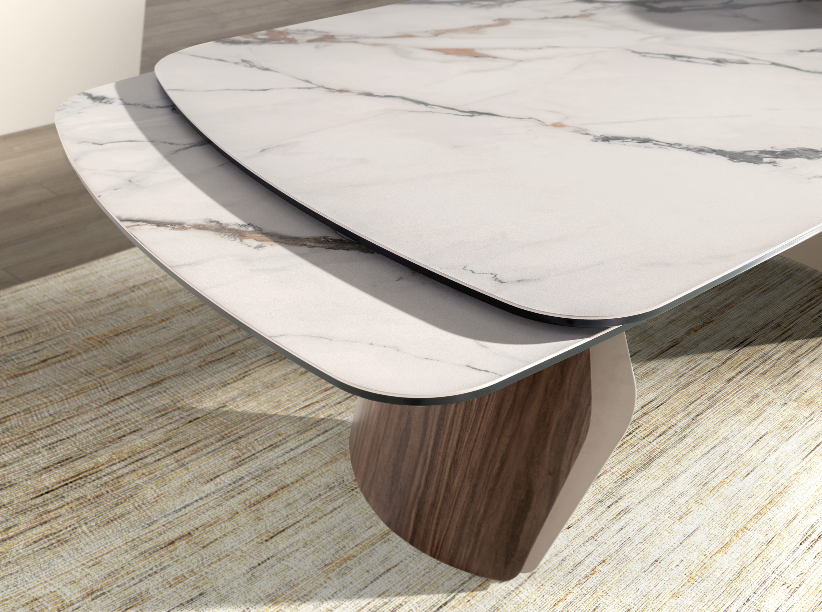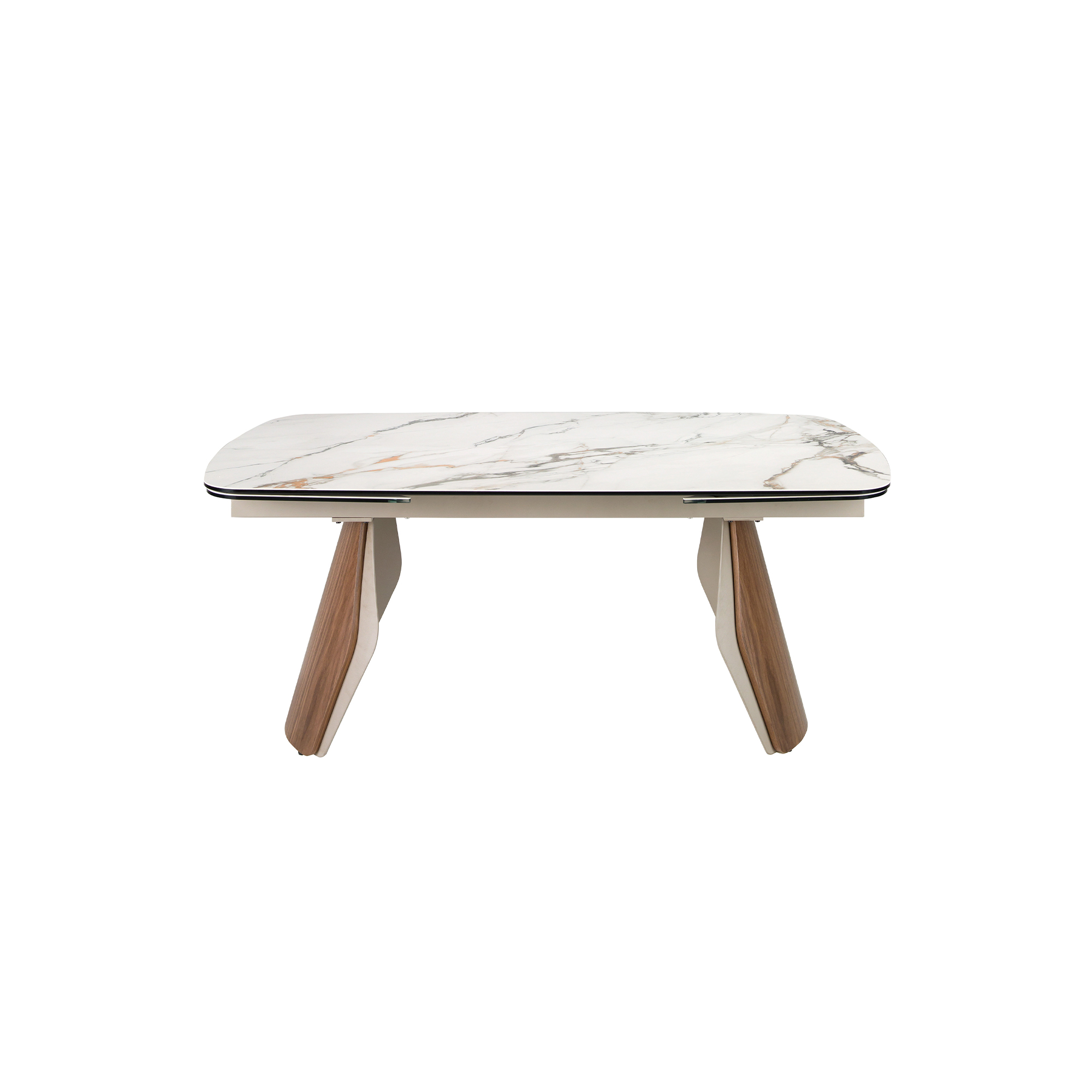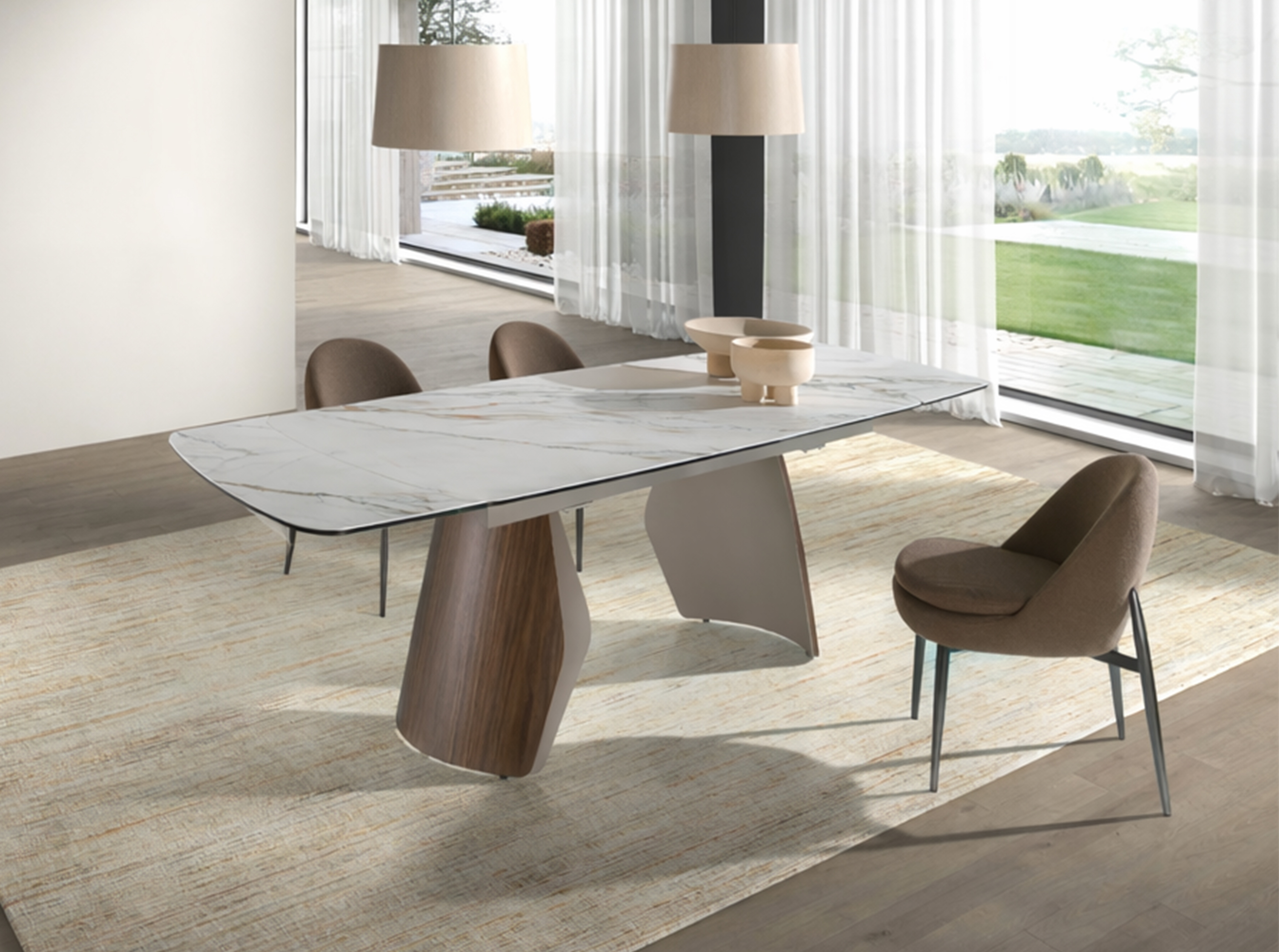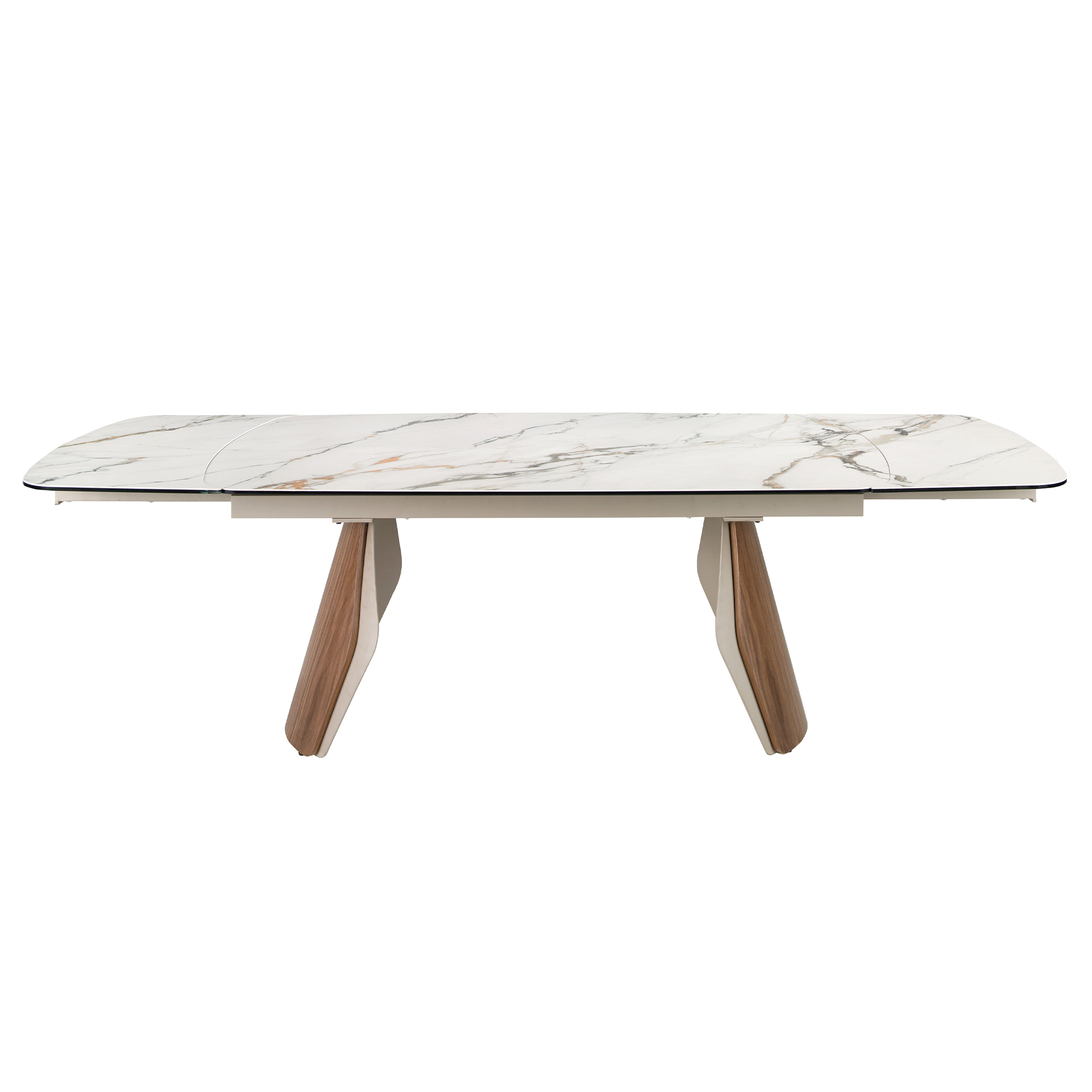 Mesa comedor extensible ovalada barril de diseño moderno con tapa de mármol porcelánico blanco con vetas en tonalidades grises y marrones en acabado mate. Sus patas de acero inoxidable pintado en color arena efecto metalizado y madera chapada en nogal natural de 0,5 mm de espesor así como su adaptabilidad, la convierten en un mueble totalmente funcional y versátil para el día a día.
