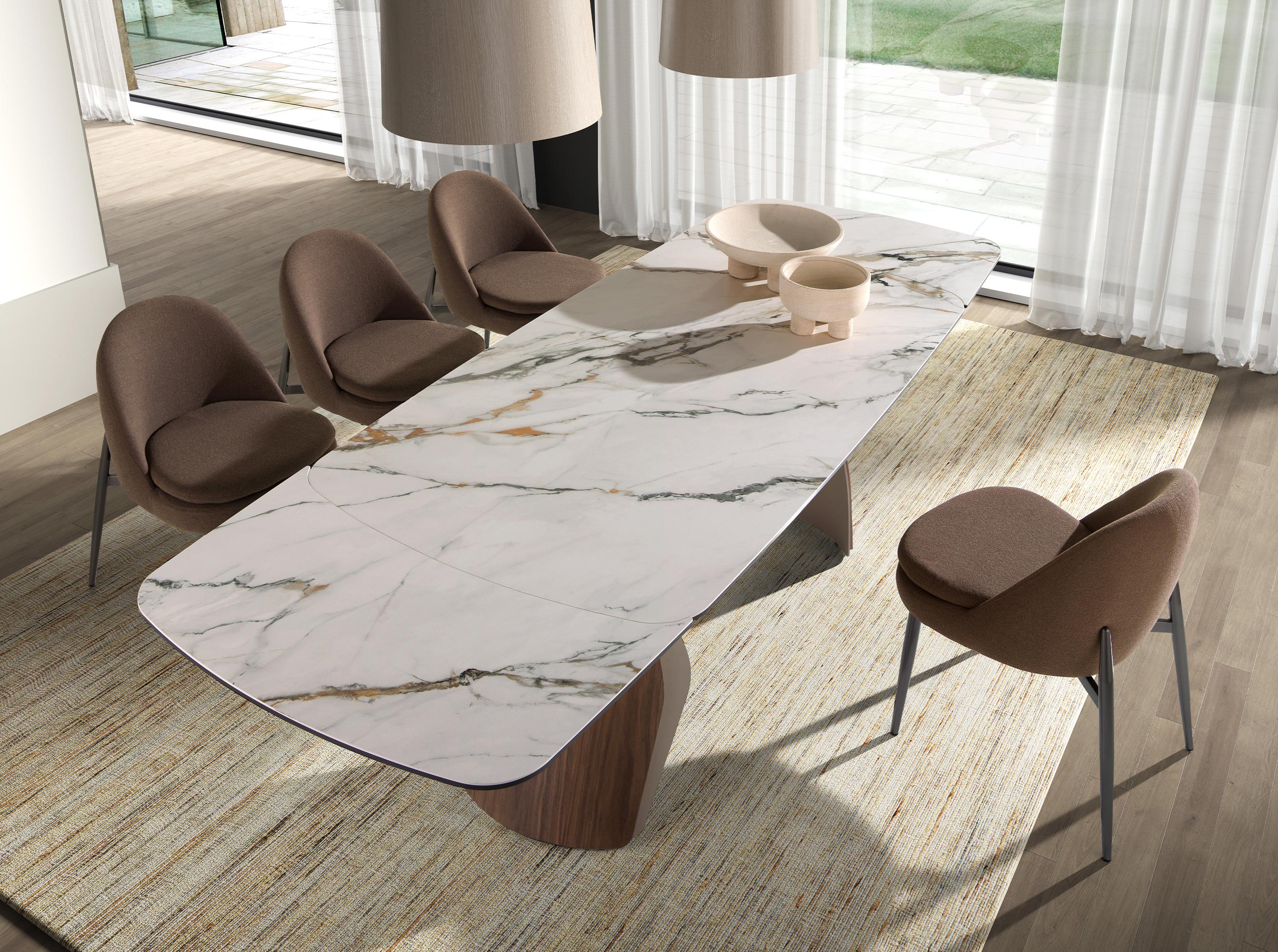 Mesa comedor extensible ovalada barril mármol porcelánico, acero arena metalizado y nogal modelo 1193 Angel Cerdá S.L.
