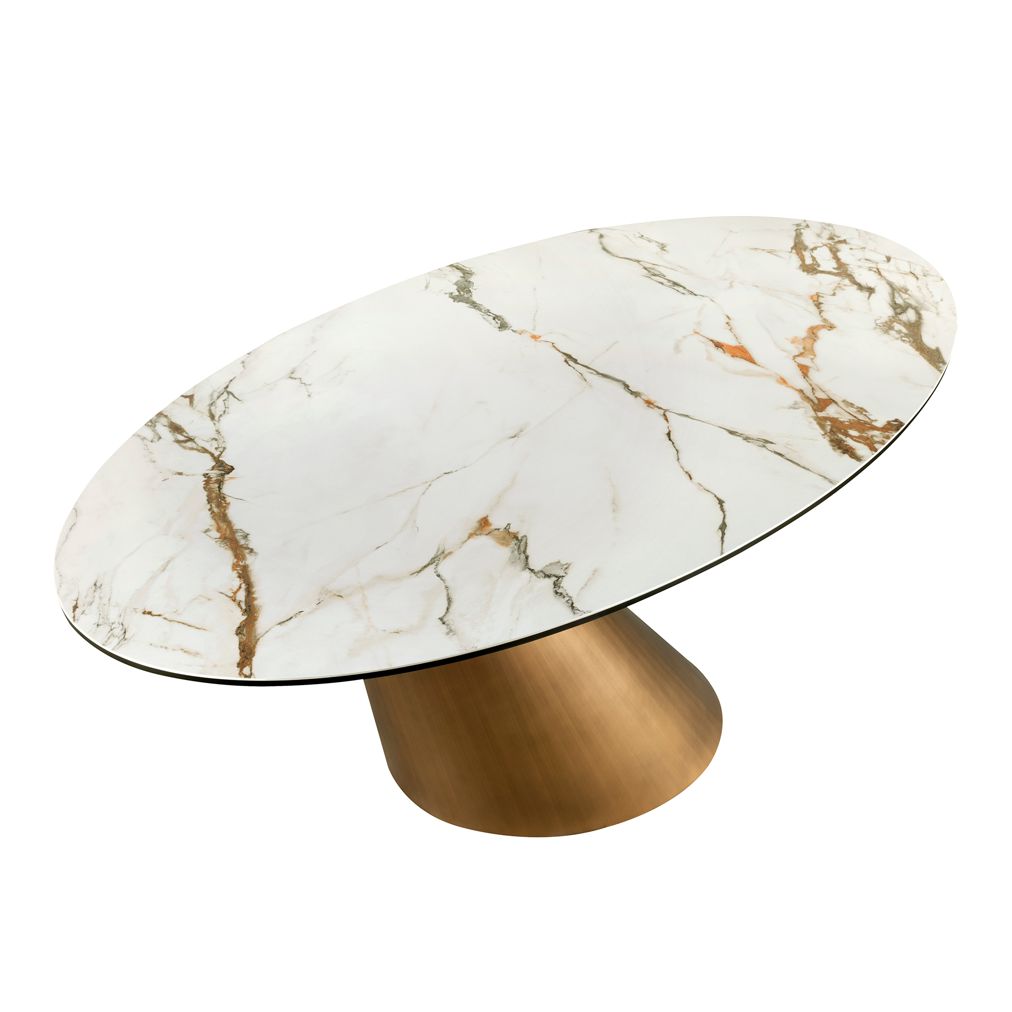 Mesa comedor ovalada de diseño moderno con tapa fija de mármol porcelánico blanco con vetas en tonalidades grises y detalles en bronce en acabado mate. Sus originales patas de acero inoxidable color bronce son elementos claves a destacar de su diseño.