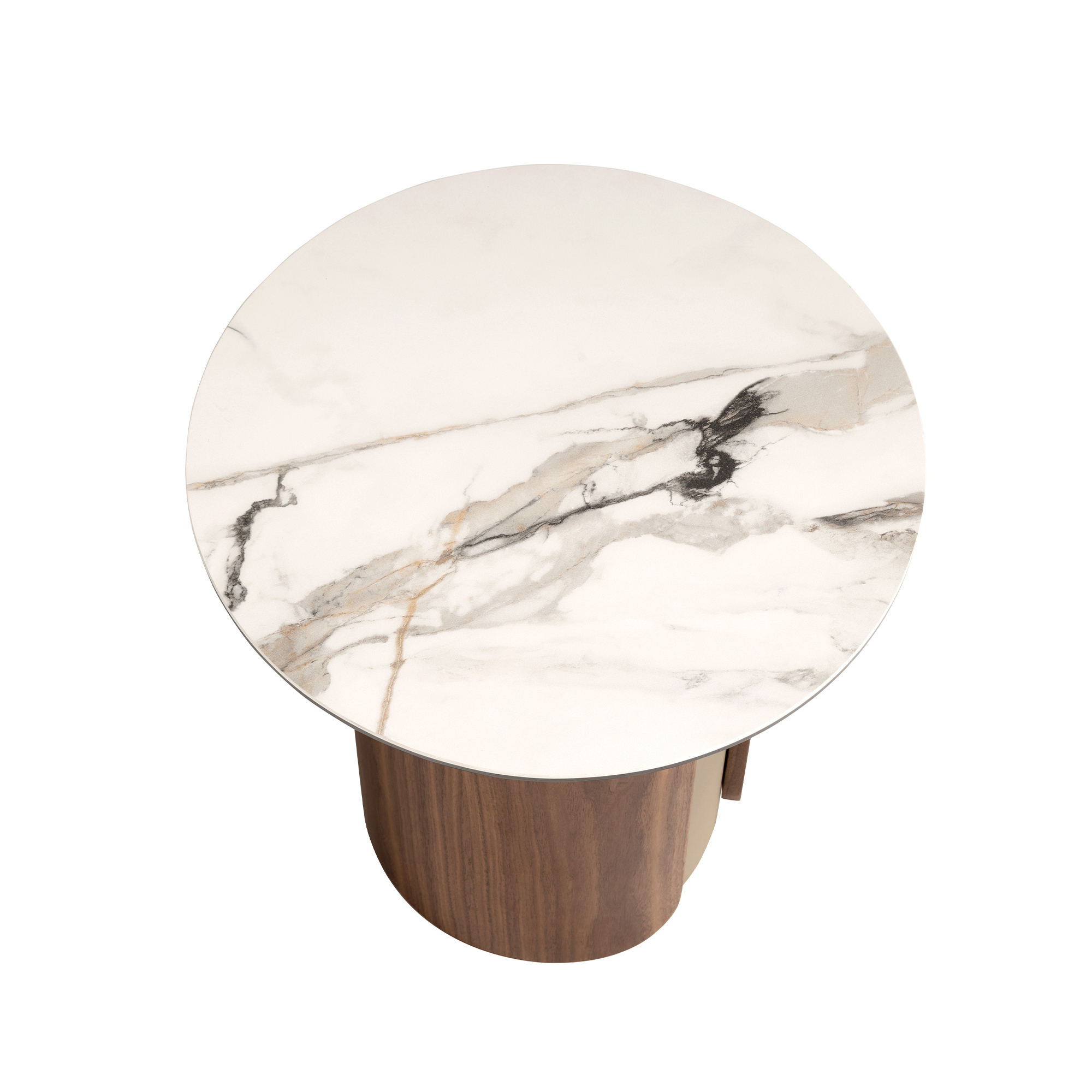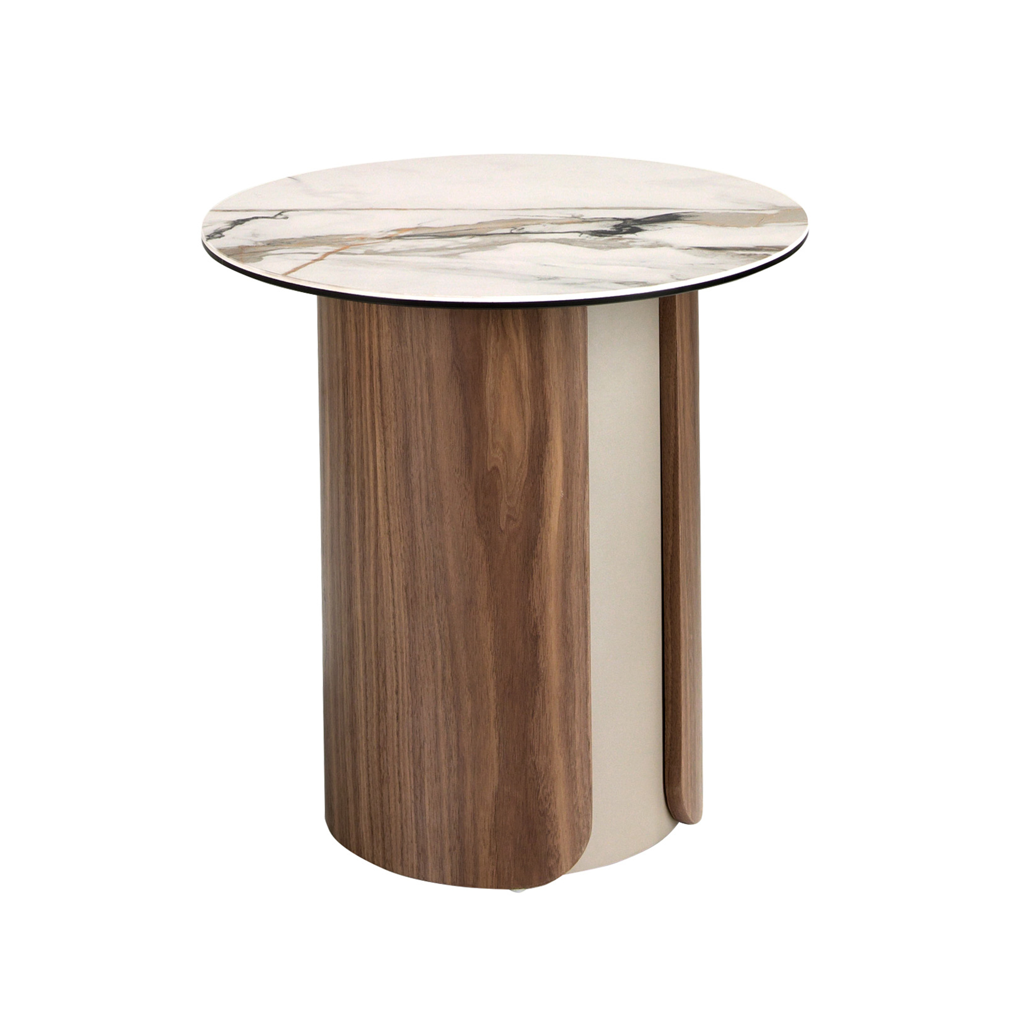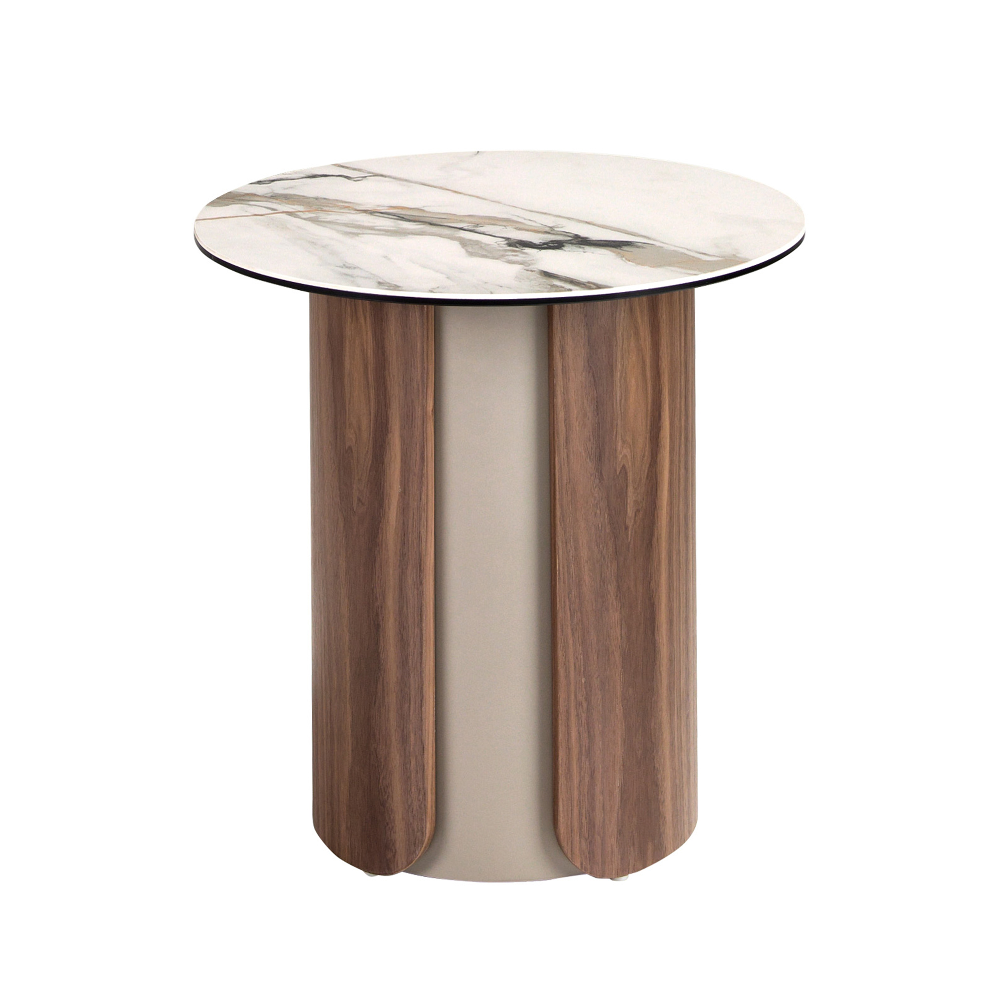 Mesa rincón redonda de diseño moderno con tapa de mármol porcelánico blanco con vetas en tonalidades grises y marrones en acabado mate. Originales patas de acero inoxidable pintado en color arena efecto metalizado y madera chapada en nogal natural de 0,5 mm de espesor. Una pieza con un diseño sencillo a la vez que original, con la que aportará un toque único y personal.