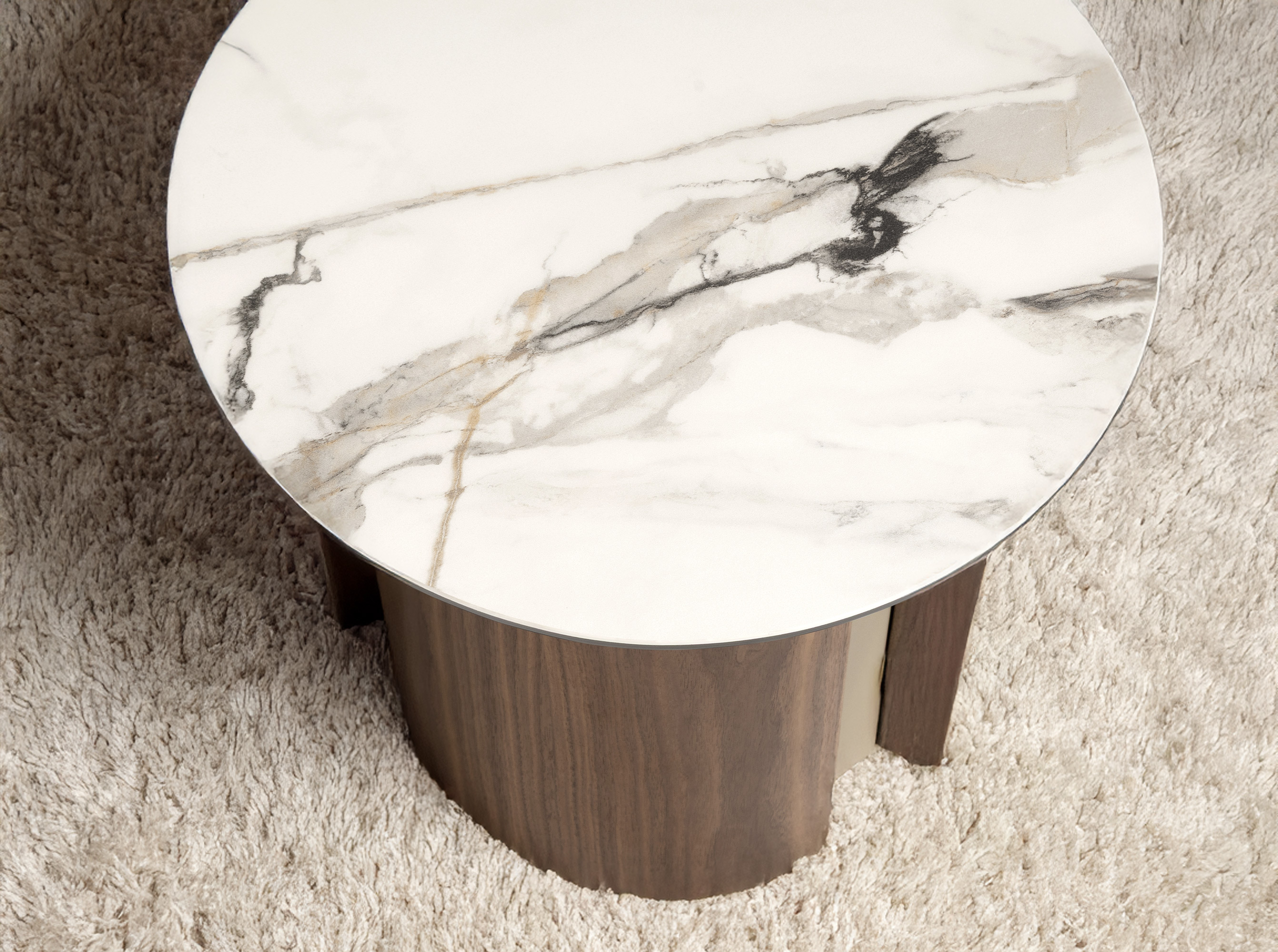 Mesa rincón redonda mármol porcelánico, acero arena metalizado y nogal modelo 2166 Angel Cerdá S.L.