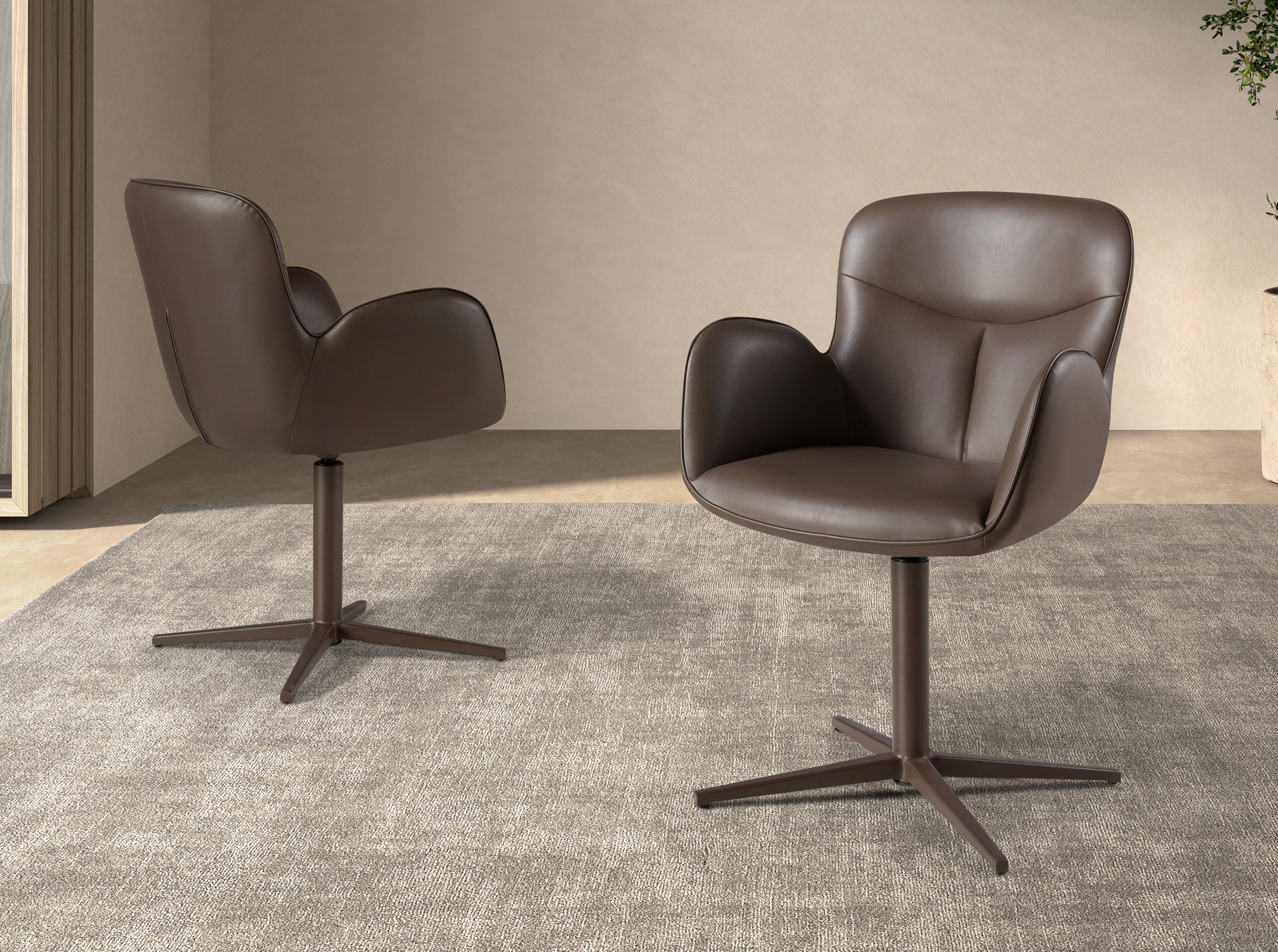 Chaise pivotante avec accoudoirs au design moderne avec assise et dossier rembourrés en similicuir marron chocolat. Ses pieds en acier peint en marron chocolat, au style à la fois avant-gardiste et intemporel, en feront un indispensable pour votre cuisine ou salle à manger. Cette chaise signée Angel Cerdá allie le style unique et personnel de la marque à un confort et une stabilité optimaux, grâce à la haute qualité de son revêtement et à l’originalité de sa structure de pieds.