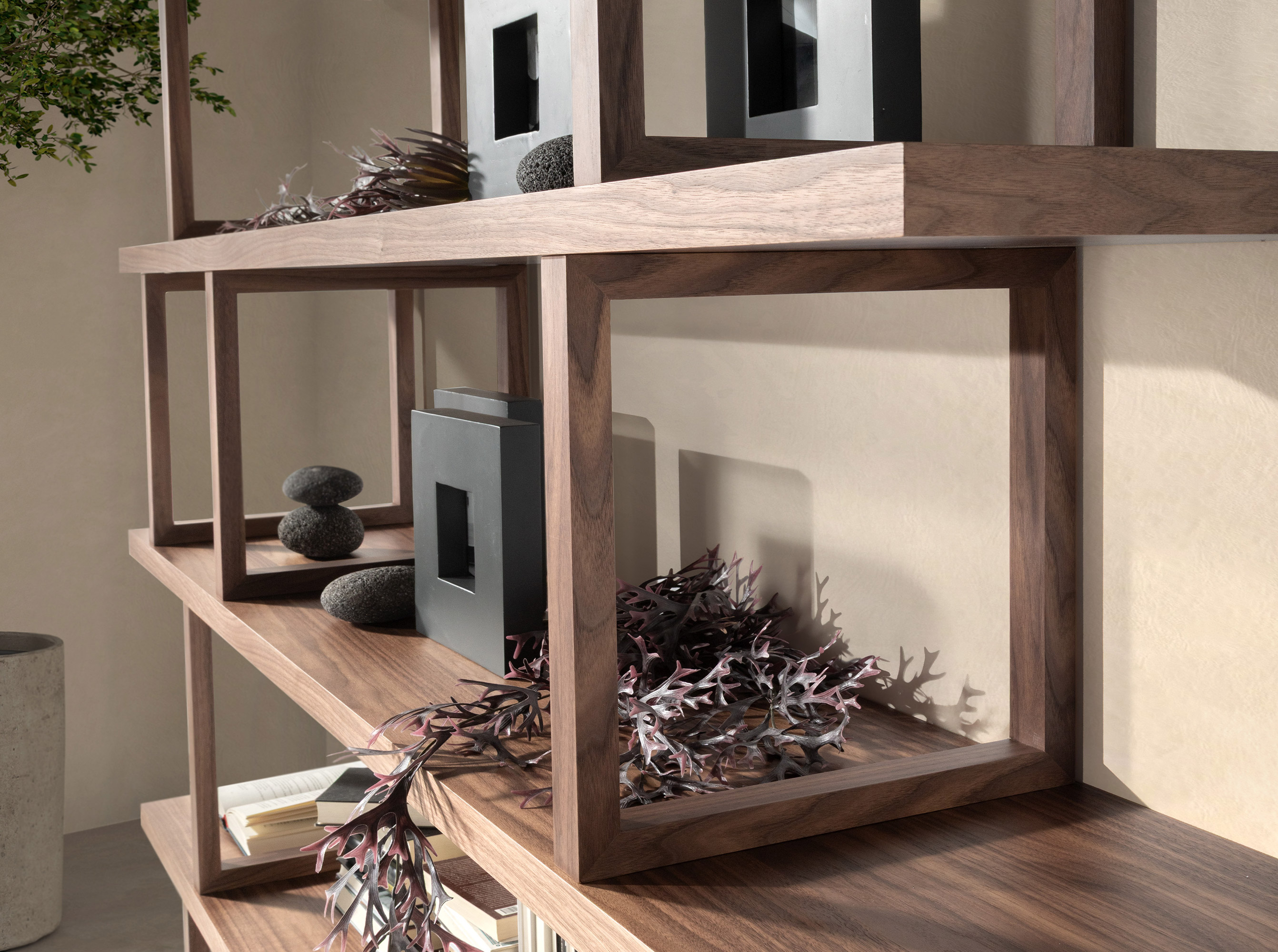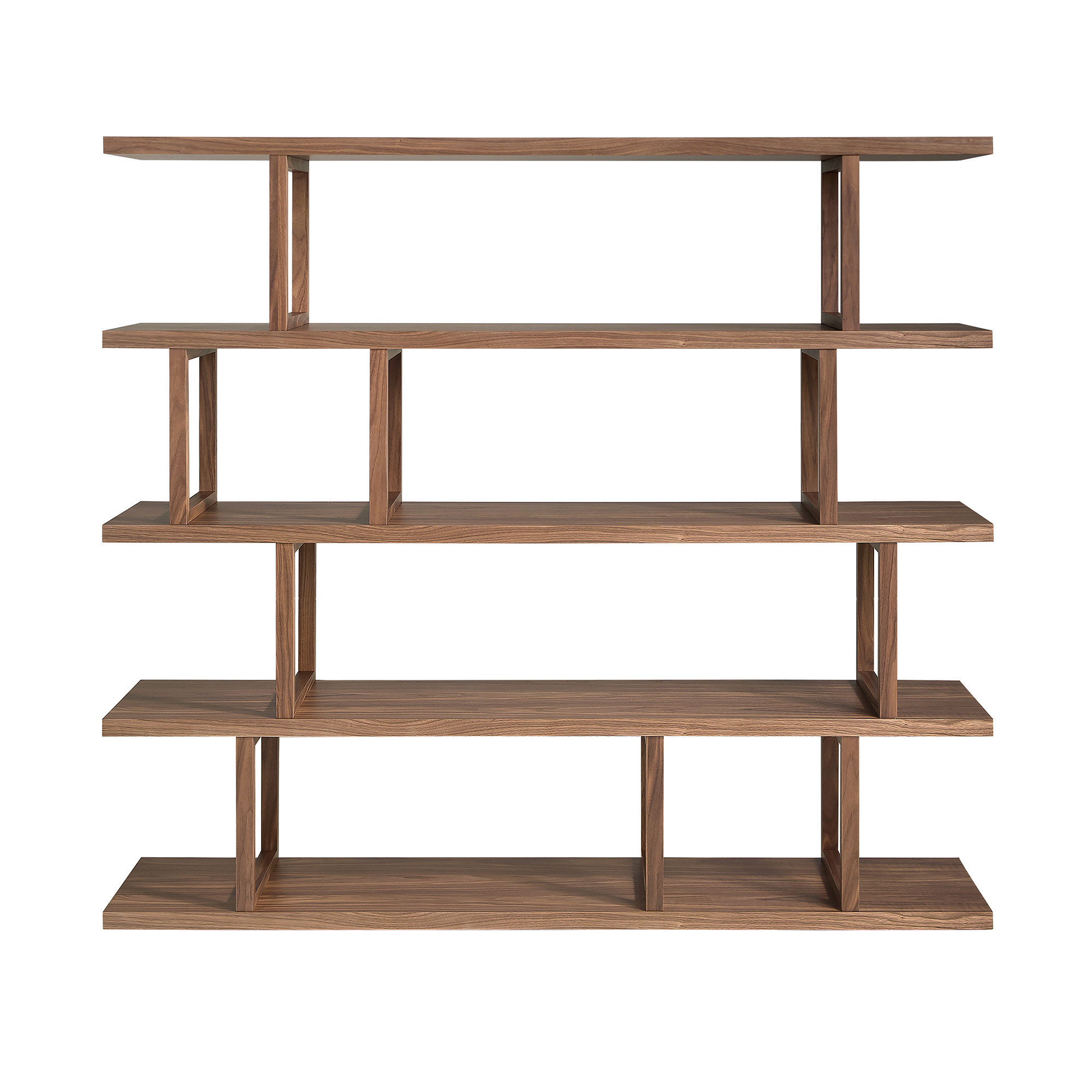 Étagère de design moderne avec structure et étagères en bois plaqué noyer naturel de 0,5 mm d’épaisseur.