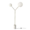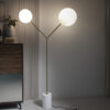Lampadaire de conception moderne avec une base en marbre porcelaine similaire à calacatta et un corps en acier doré. Deux ampoules en verre teinté blanc. Une lampe minimaliste et élégante qui apportera cette sensation de chaleur et d’espace à votre intérieur.