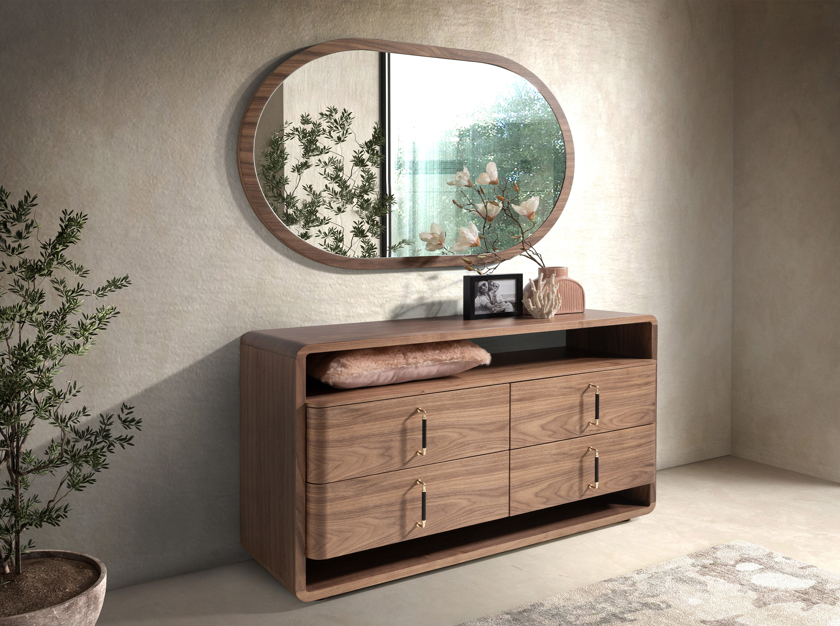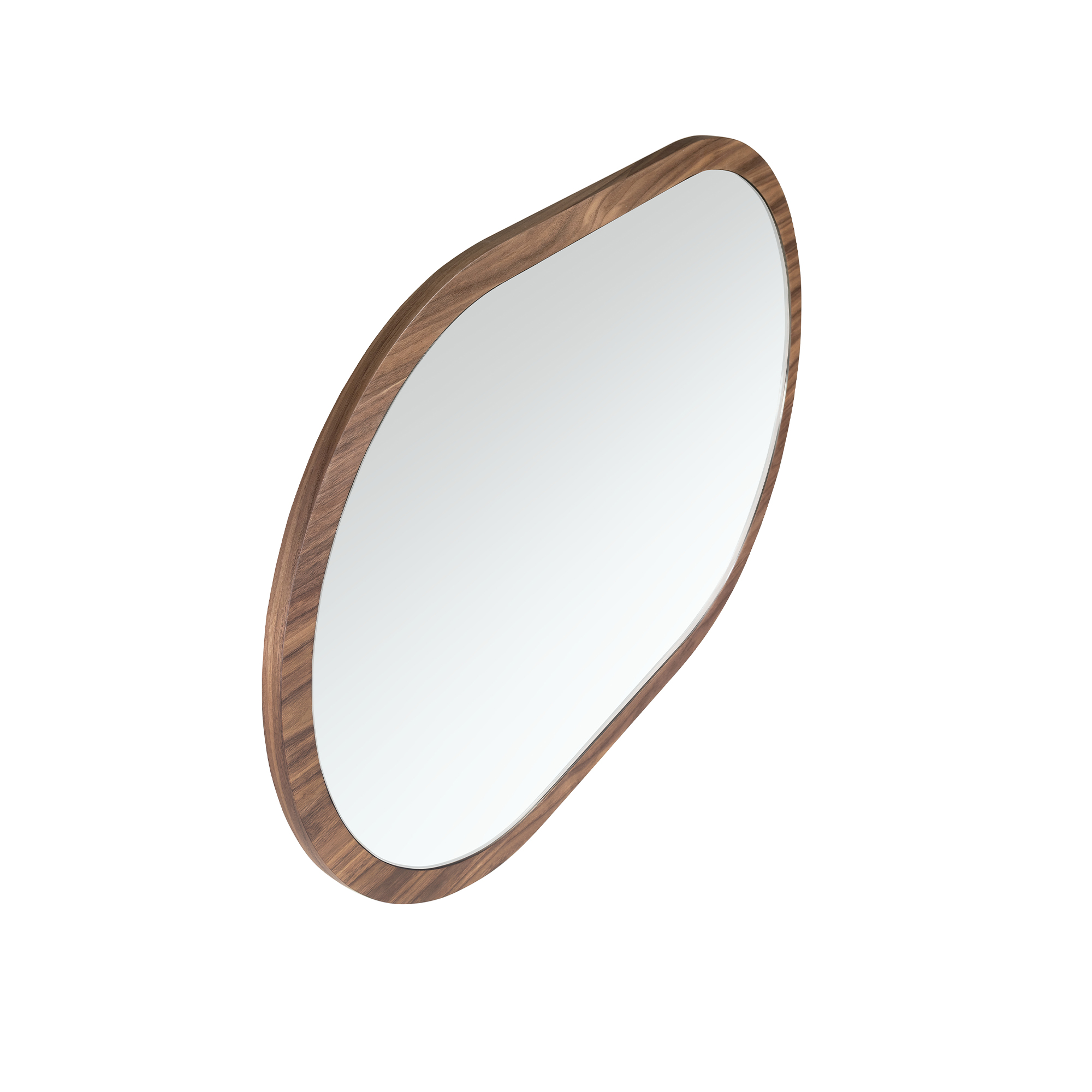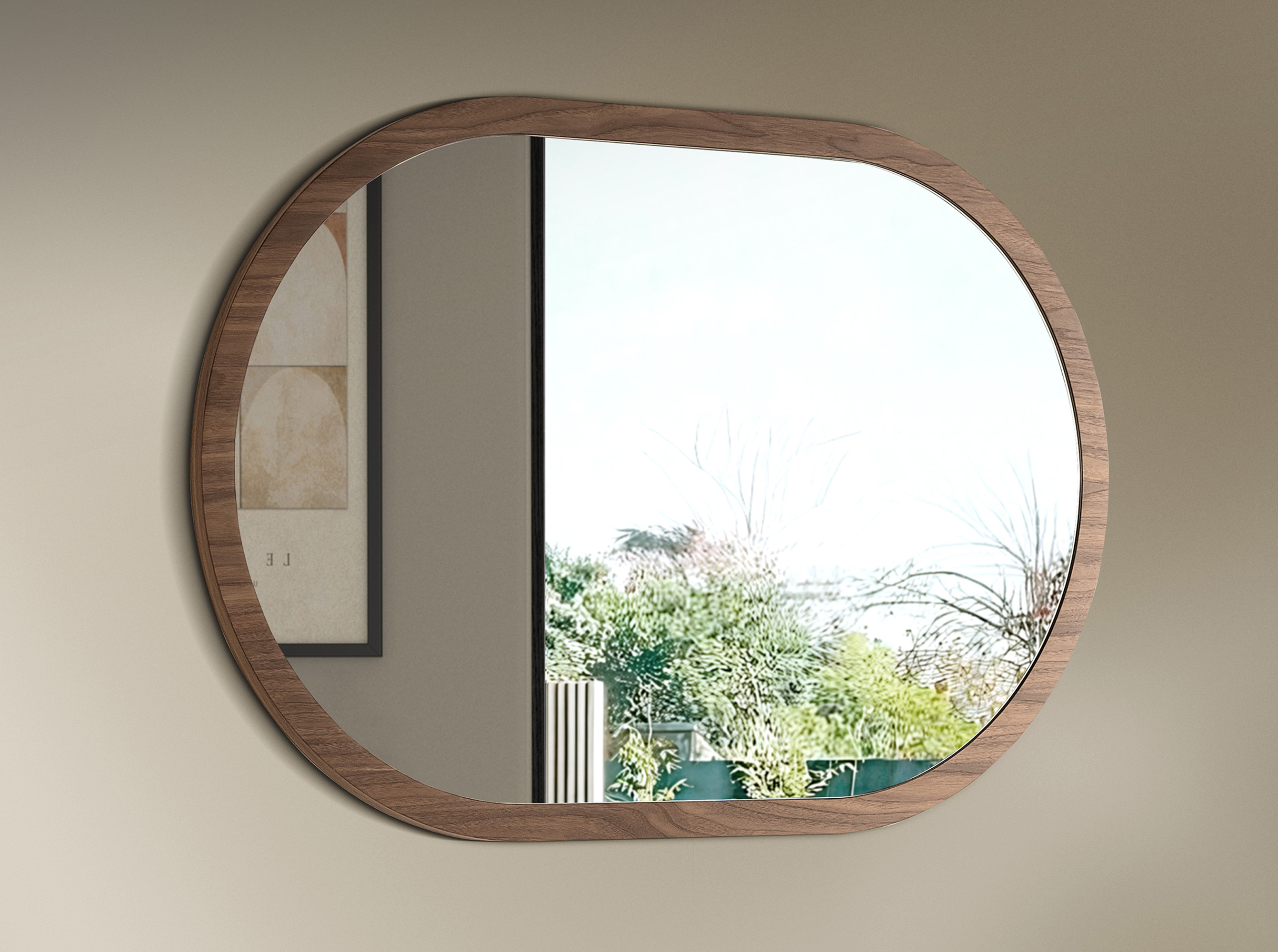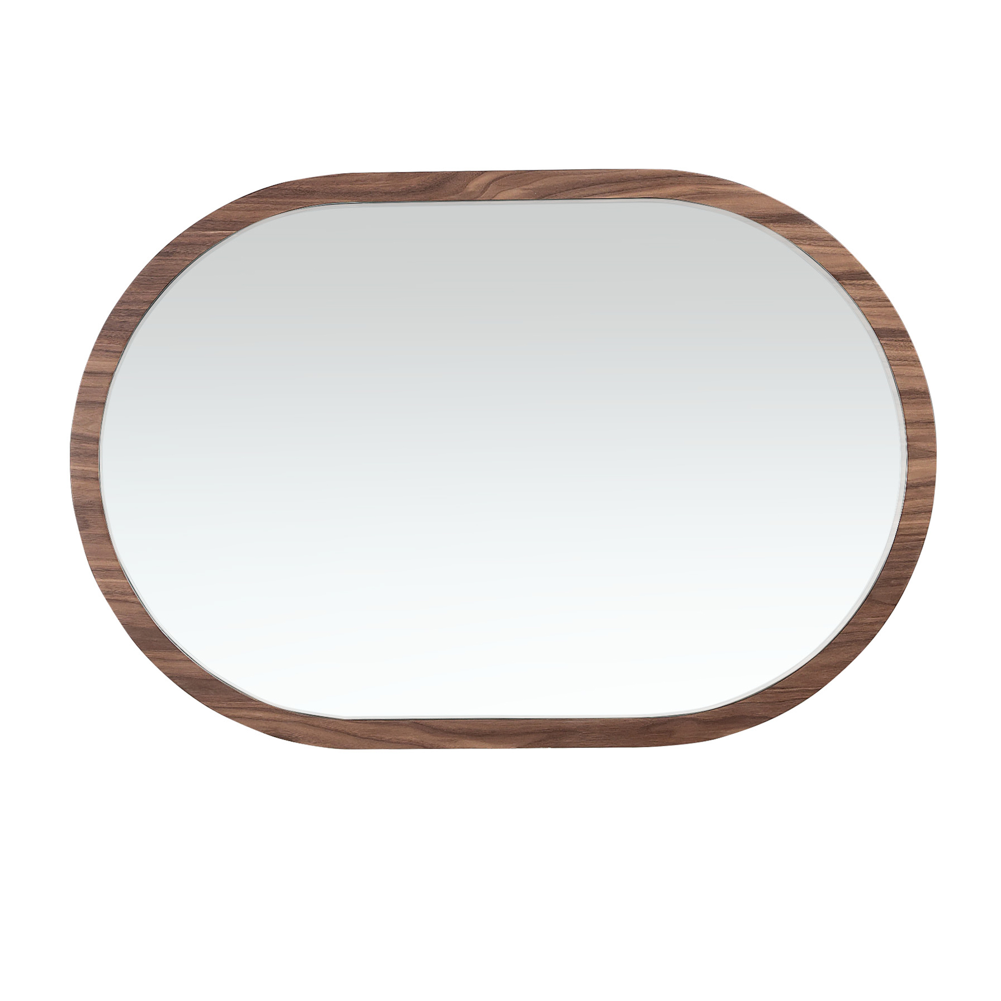 Miroir mural ovale demi-lune de design moderne avec cadre en bois plaqué noyer naturel. Ce miroir horizontal est idéal pour créer une ambiance élégante et avant-gardiste, apportant une plus grande sensation d’espace et de luminosité.