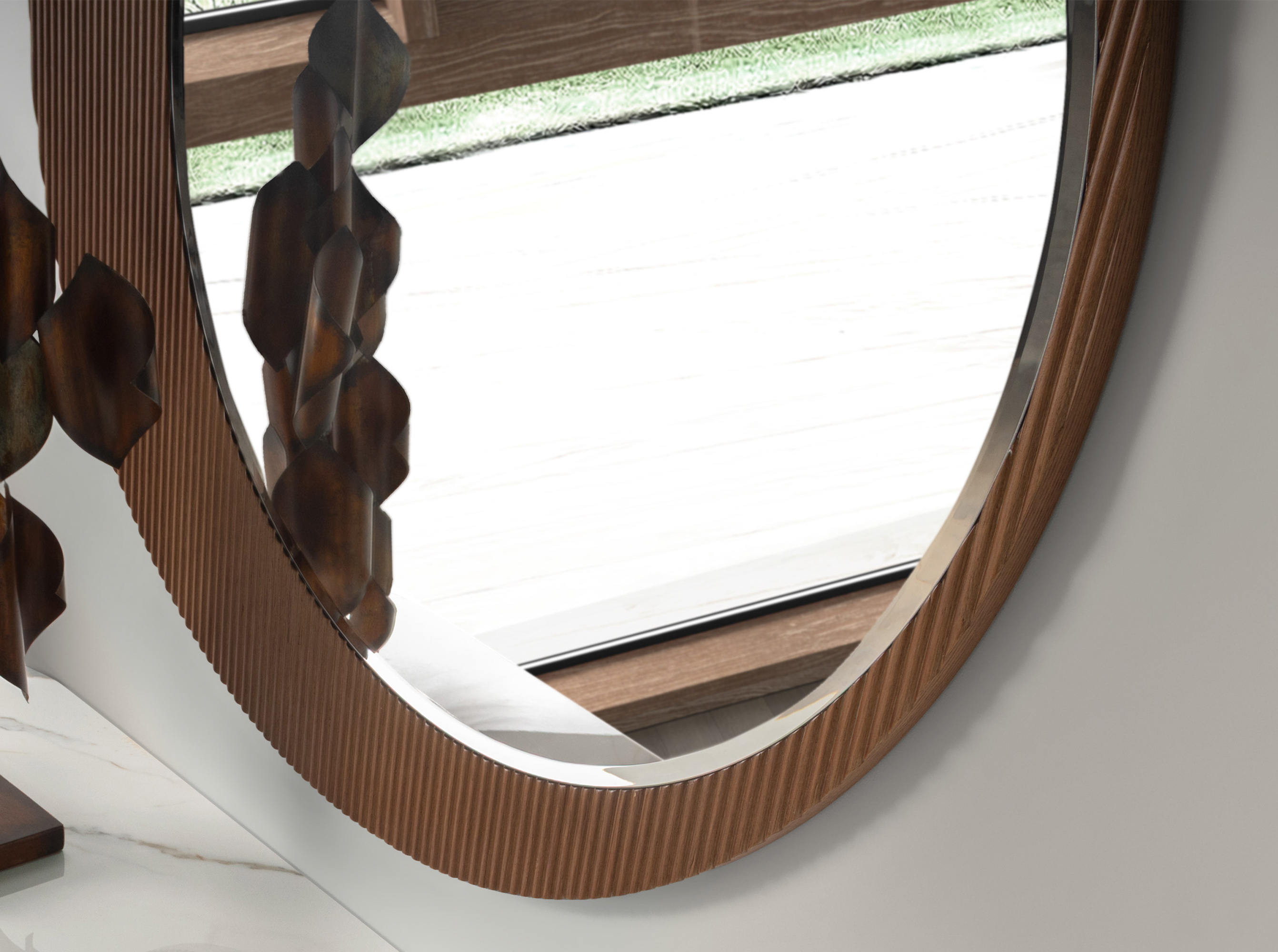 Miroir mural rond au design moderne avec cadre en bois couleur noyer. Ce miroir est idéal pour créer une atmosphère élégante et avant-gardiste, en donnant une plus grande impression d’espace et de luminosité.