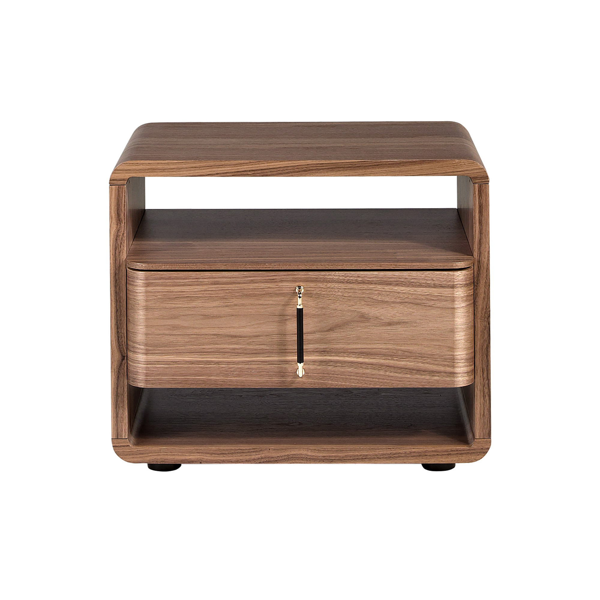 Table de chevet au design moderne avec structure en placage de noyer naturel et pieds originaux en PVC noir. Elle dispose d’un large espace de rangement avec 1 tiroir avec système d’ouverture par poignée languette et fermeture soft-closing.