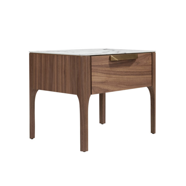 Comodino dal design moderno con struttura in legno impiallacciato in noce naturale e originali gambe in legno impiallacciato in noce naturale. Grazie all’elegante piano in vetro che imita il marmo porcellanato bianco con venature grigie in finitura lucida, otterrete il look sofisticato che cercate nelle vostre stanze. Dispone di un ampio spazio di archiviazione con 1 cassetto con sistema di apertura a strappo e chiusura ammortizzata.