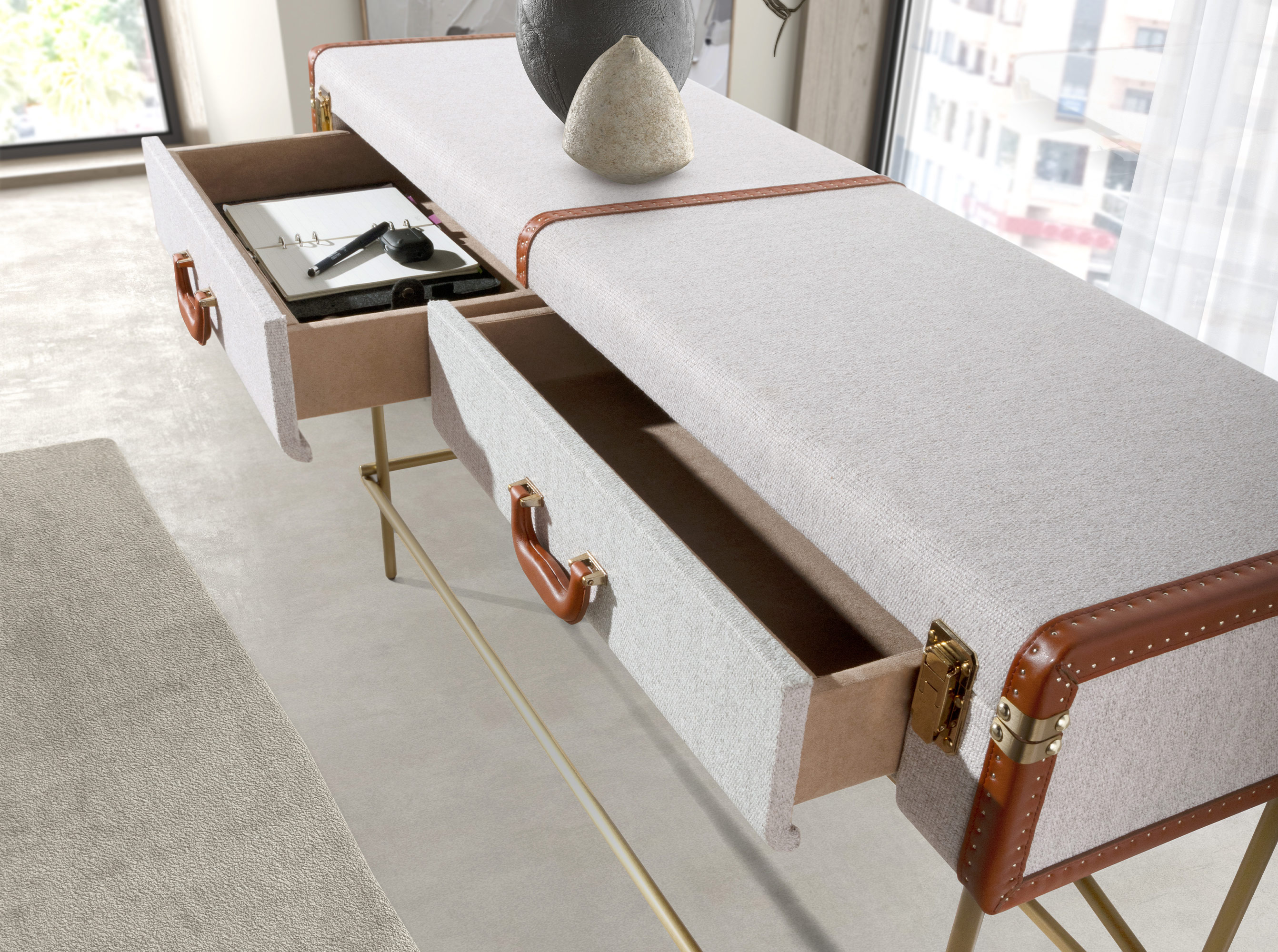 – Il tessuto di questa originale consolle rivestita in tessuto grigio darà il tocco diverso e moderno che cercate per la vostra casa.